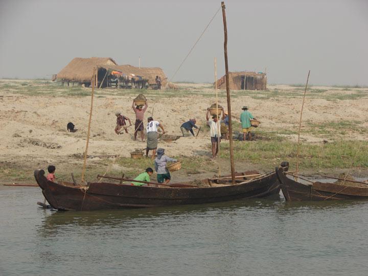 Mit dem Boot nach Mingun Hier wird Sand verladen der nach Mandalay gefahren wird.