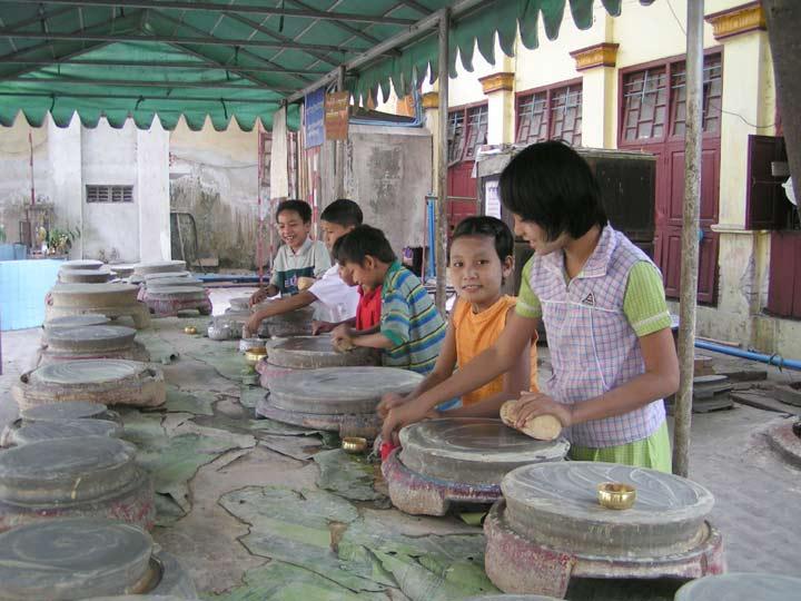 Mahamuni Pagode Kinder mahlen das Sandelholz damit die Buddha-Figur damit eingestrichen werden kann und keinen Sonnenbrand kriegt.