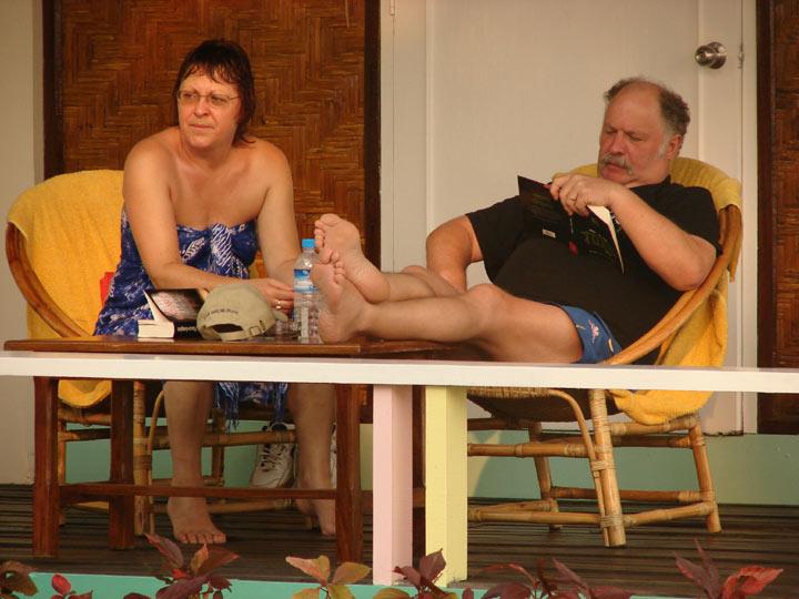 Am Strand Herr und Frau Kipfer auf ihrer Terrasse.