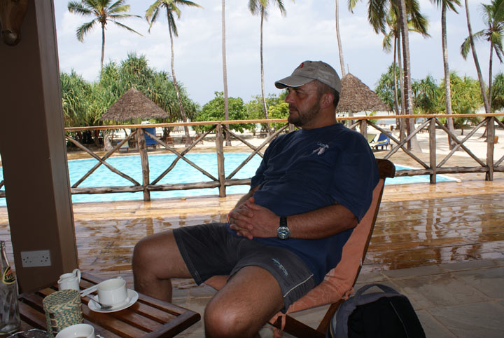 Meine Wenigkeit, beim einzigen Regen während des Tages in der ganzen Zeit auf Sansibar, an der Poolbar.