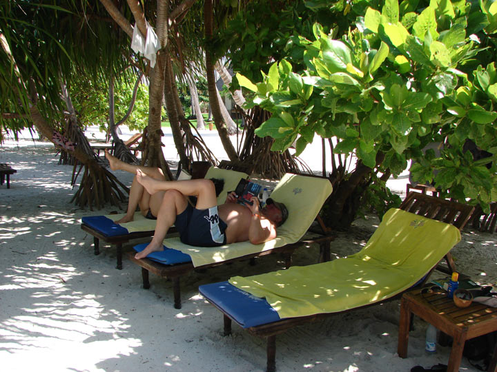 Unsere Liegen unter Schatten spendenden Bäumen.