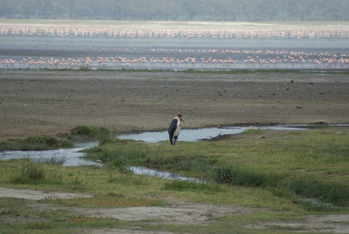 Im Hintergrund eine grosse Kolonie von Flamingos und im Vordergrund ein Marabu.