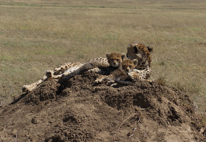 Eine Gepardenmutter mit ihren zwei Jungen.