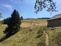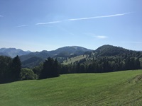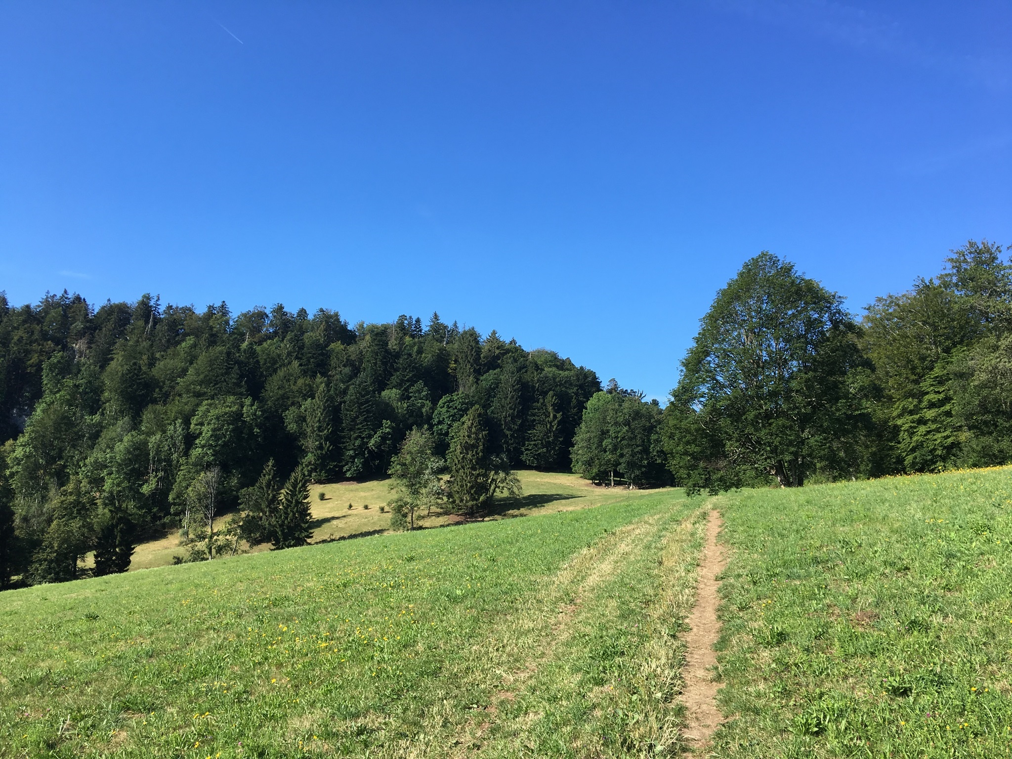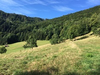 Von der Hohen Winde geht es zuerst steil hinunter bis zum Skilift, jetzt folgt leider ein Schotter- und später ein geteerter Weg.