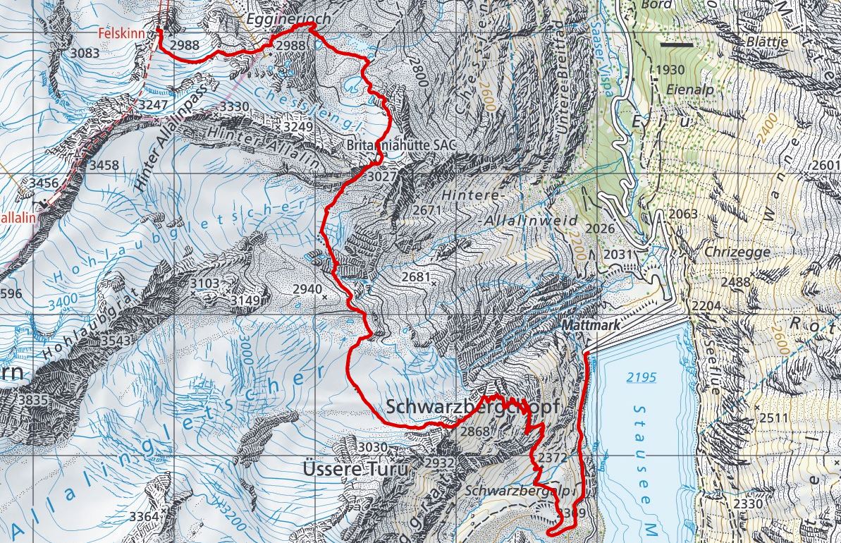 - Route: Mattmark - Schwarzbergchopf - Allalingletscher - Hohlaubgletscher - Britanniahütte - Egginerjoch - Felskinn