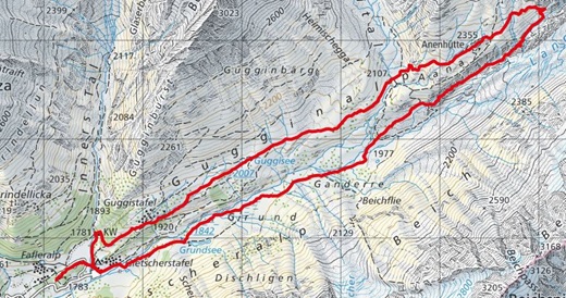 - Route: Fafleralp - Grund - Gletschererlebnissweg - Anusee - Anenhütte - Guggisee - Guggistafel - Fafleralp