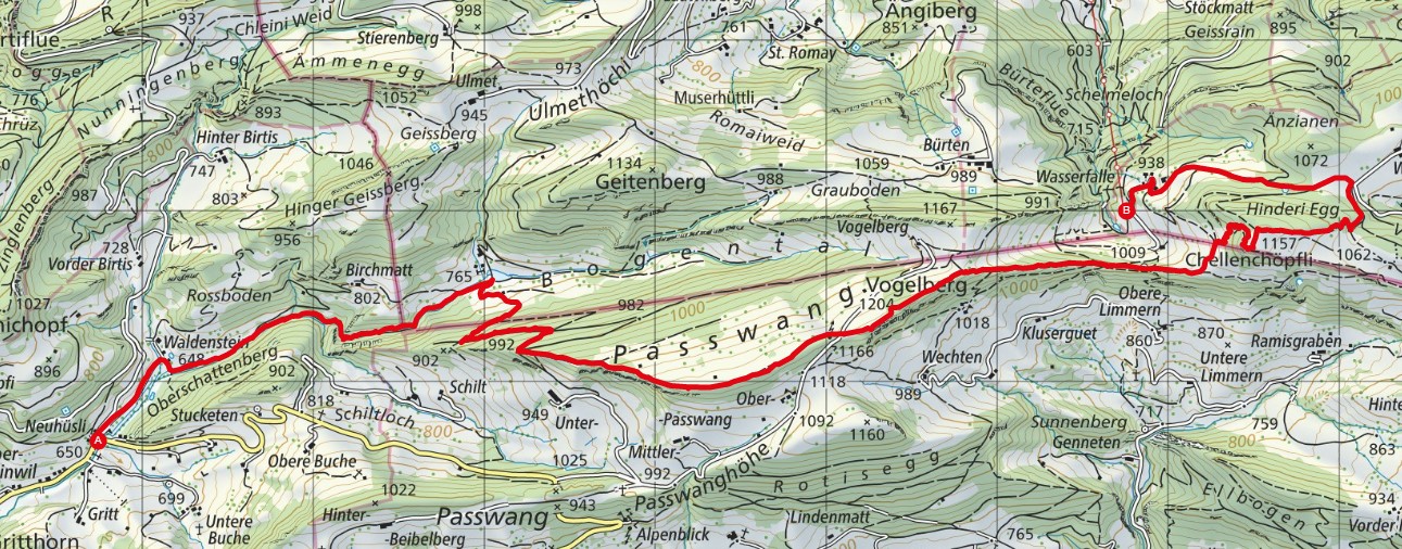 - Route: Neuhüsli - Chessiloch - Bogenthal - Vogelberg - Hintere Wasserfalle - Chellenchöpfli - Hinderi Egg - Wasserfallen