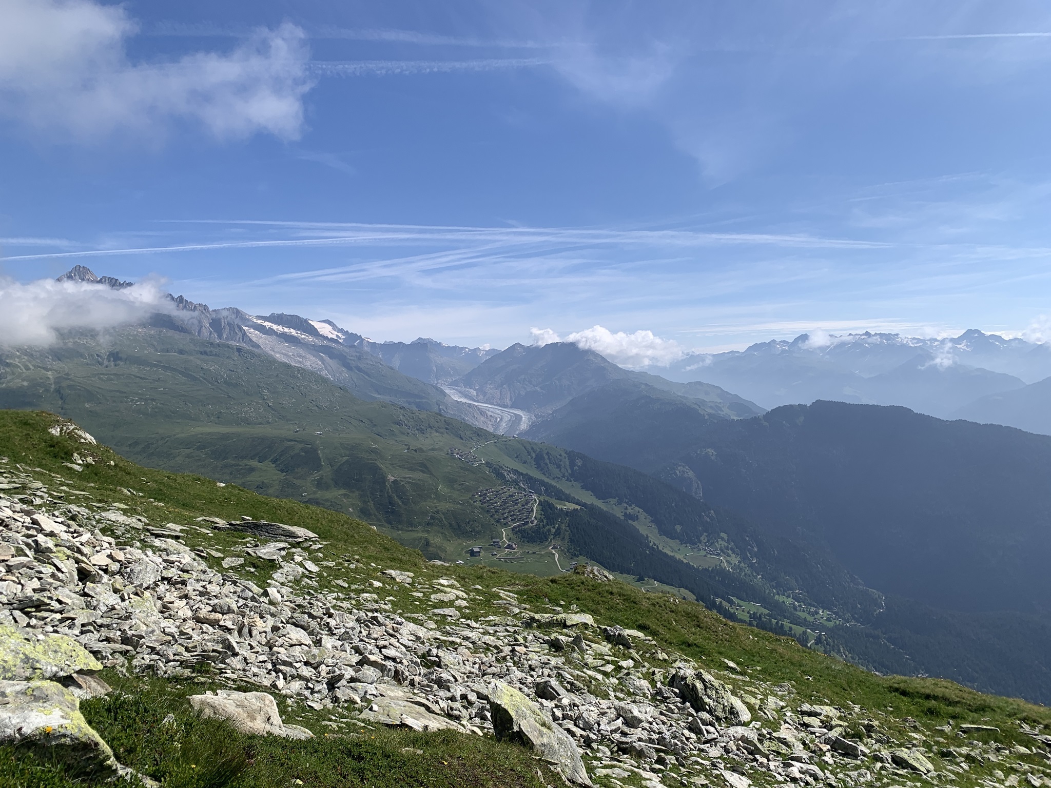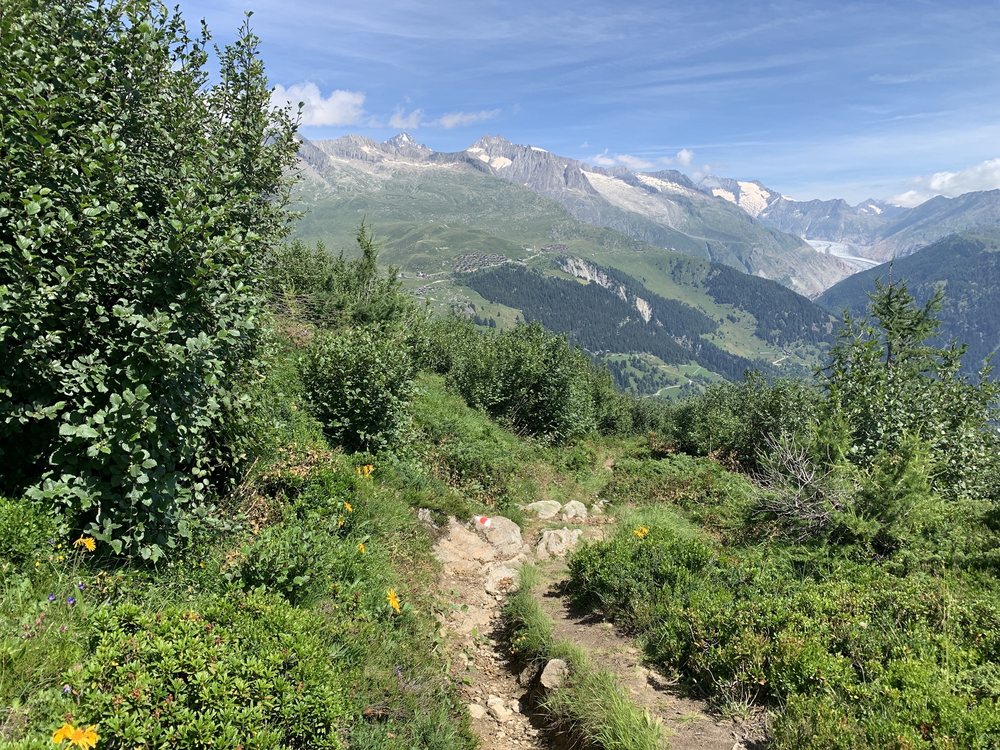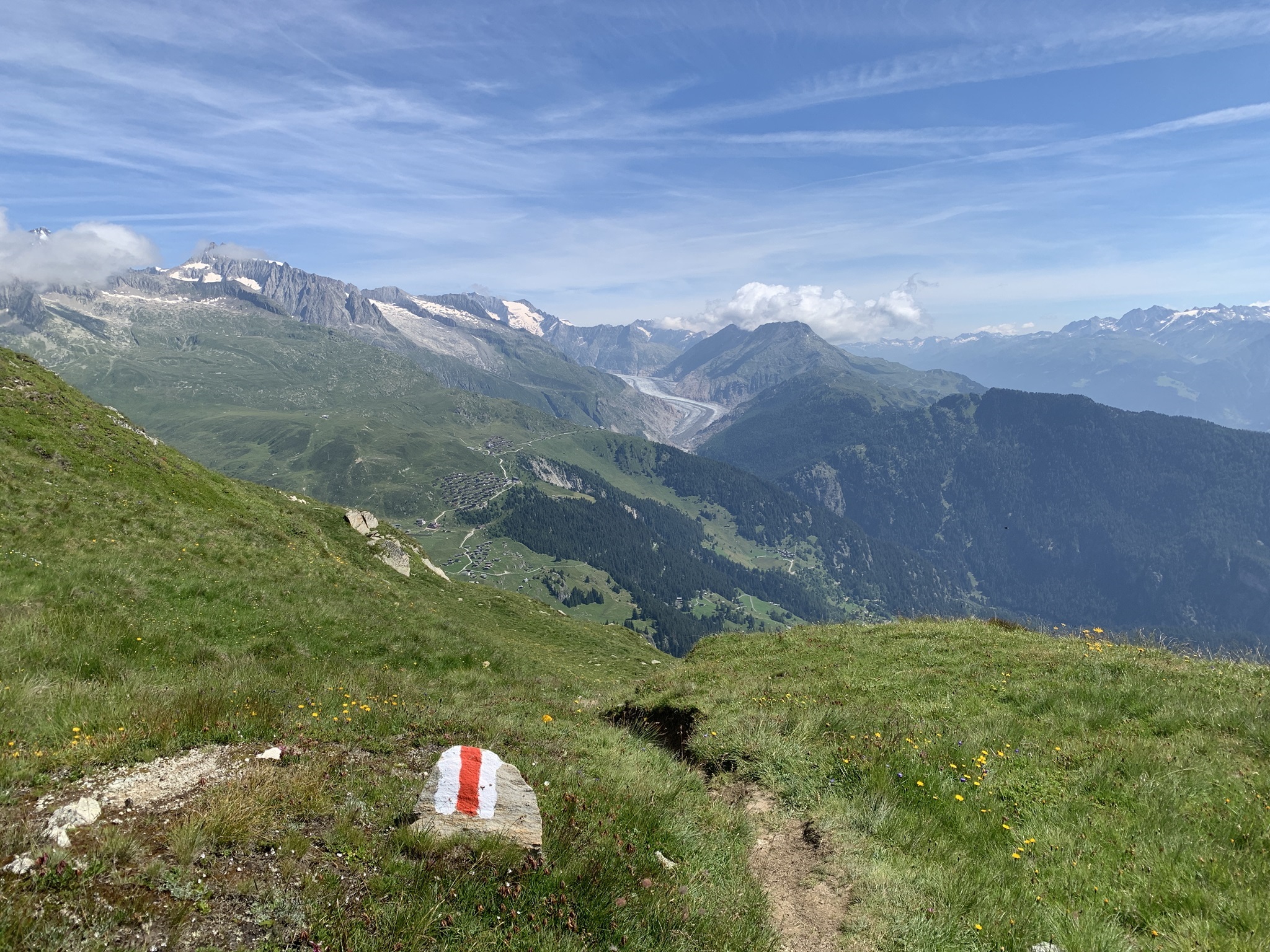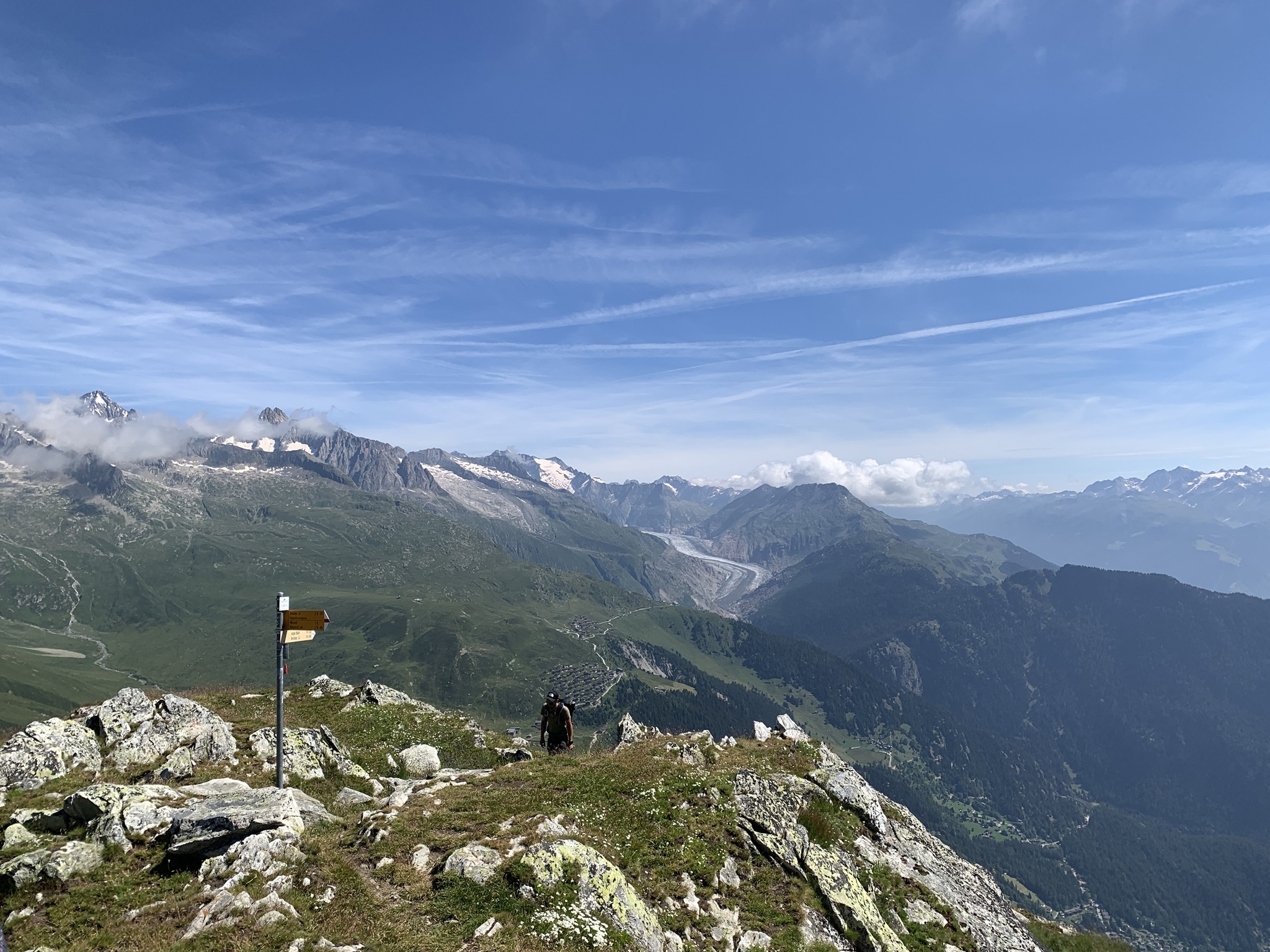 Zuerst geht es ein kurzes Stück hinunter zum Chelchbach. Jetzt geht es aber sehr steil hinauf zum Grat. Aber man hat die ganze Zeit einen schönen blick in das Tal und auch schon bald auf den Aletschgletscher. Auf dem Grat angekommen geht es recht gemütlich weiter aufwärts bis zum Foggenhorn. Hier hat man dann einen wunderschöne Rundumsicht. Es ist sogar das Matterhorn zu sehen.