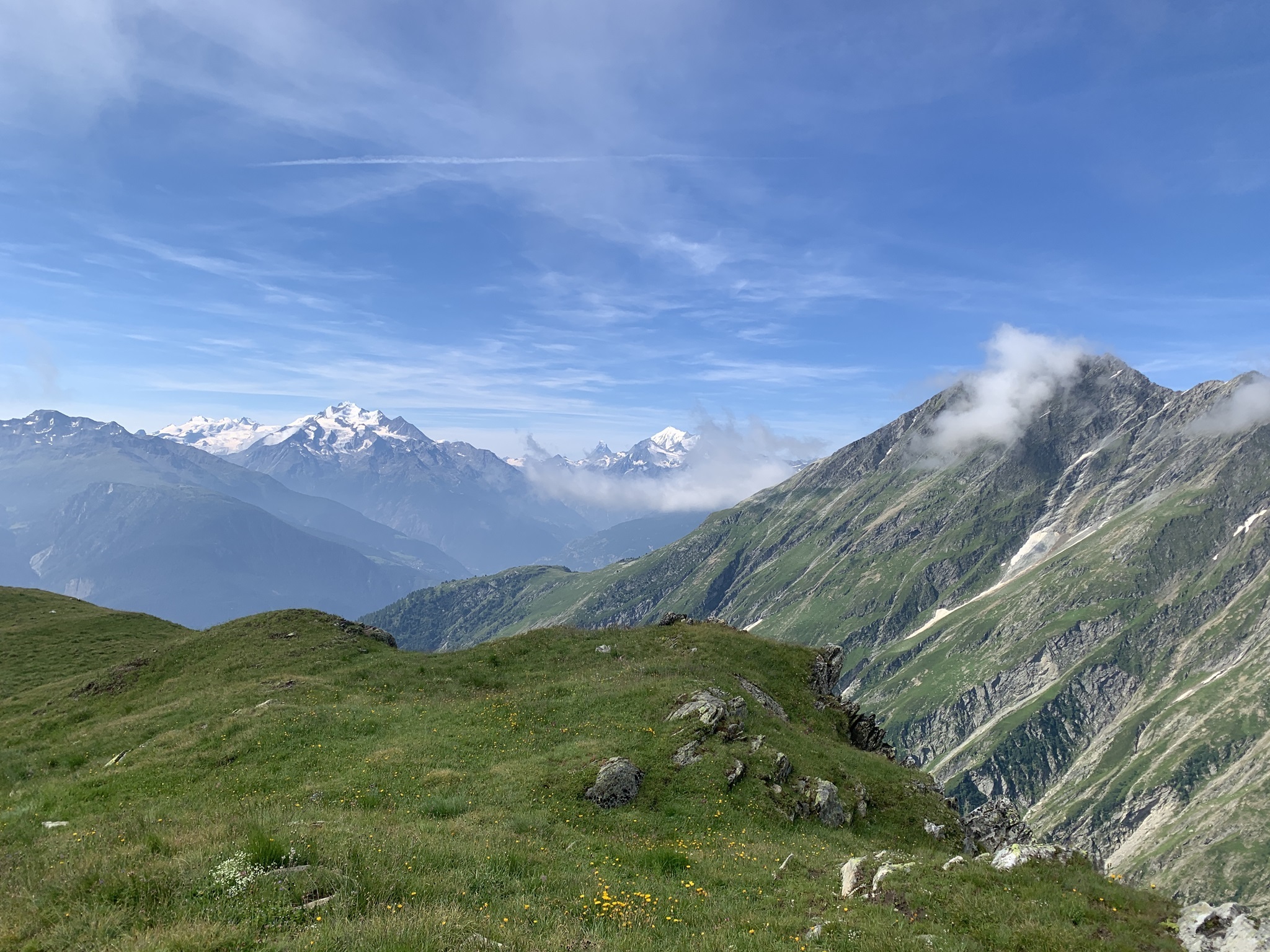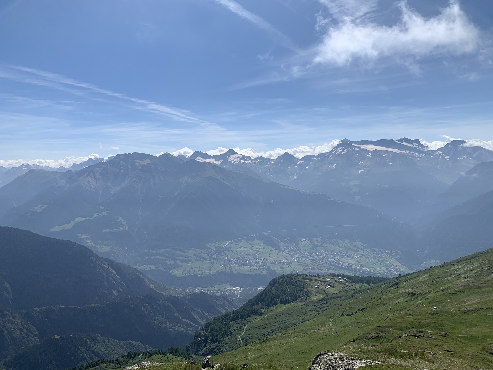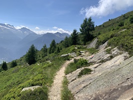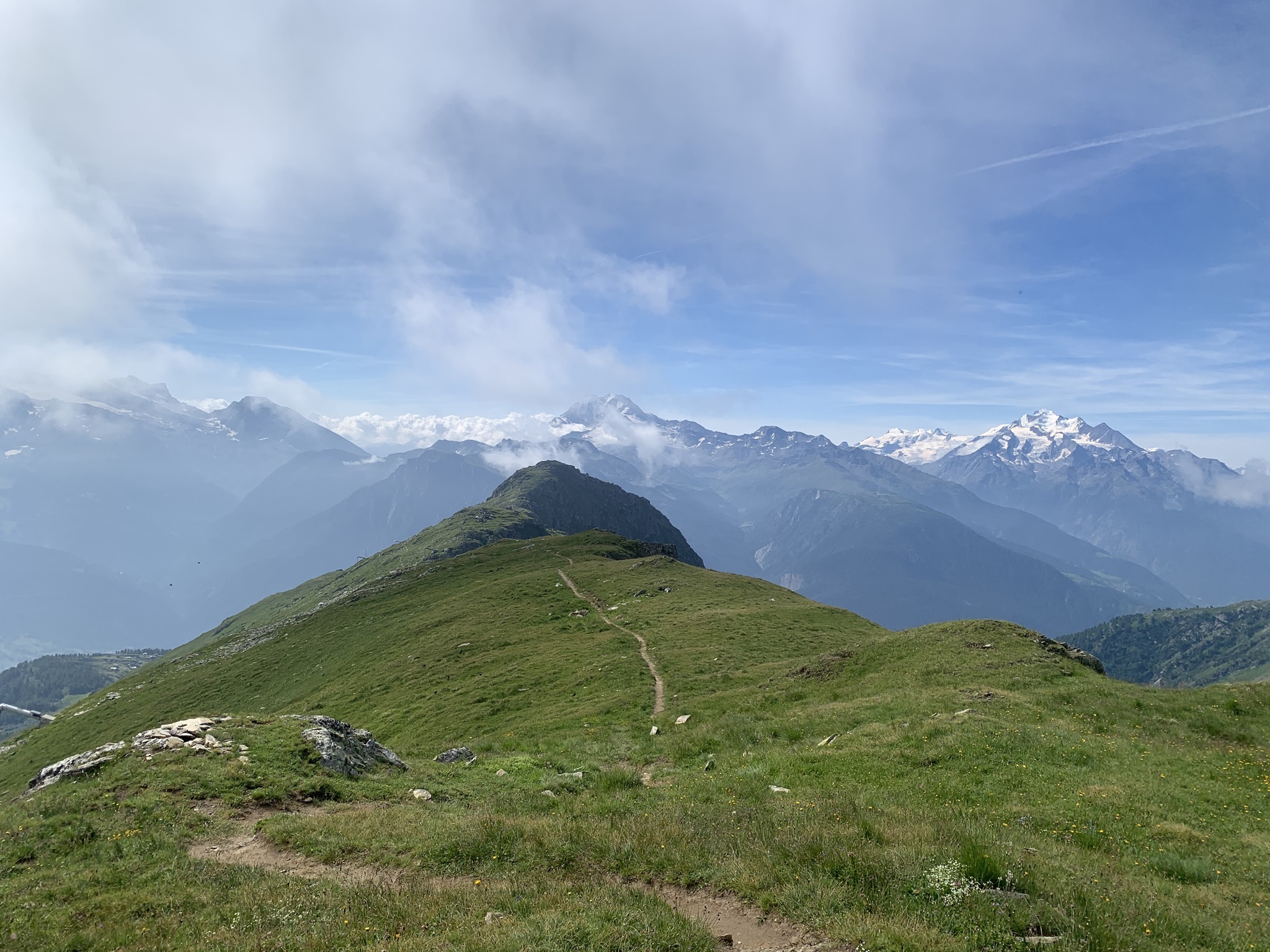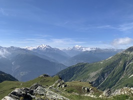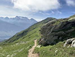 Zuerst geht es ein kurzes Stück hinunter zum Chelchbach. Jetzt geht es aber sehr steil hinauf zum Grat. Aber man hat die ganze Zeit einen schönen blick in das Tal und auch schon bald auf den Aletschgletscher. Auf dem Grat angekommen geht es recht gemütlich weiter aufwärts bis zum Foggenhorn. Hier hat man dann einen wunderschöne Rundumsicht. Es ist sogar das Matterhorn zu sehen.