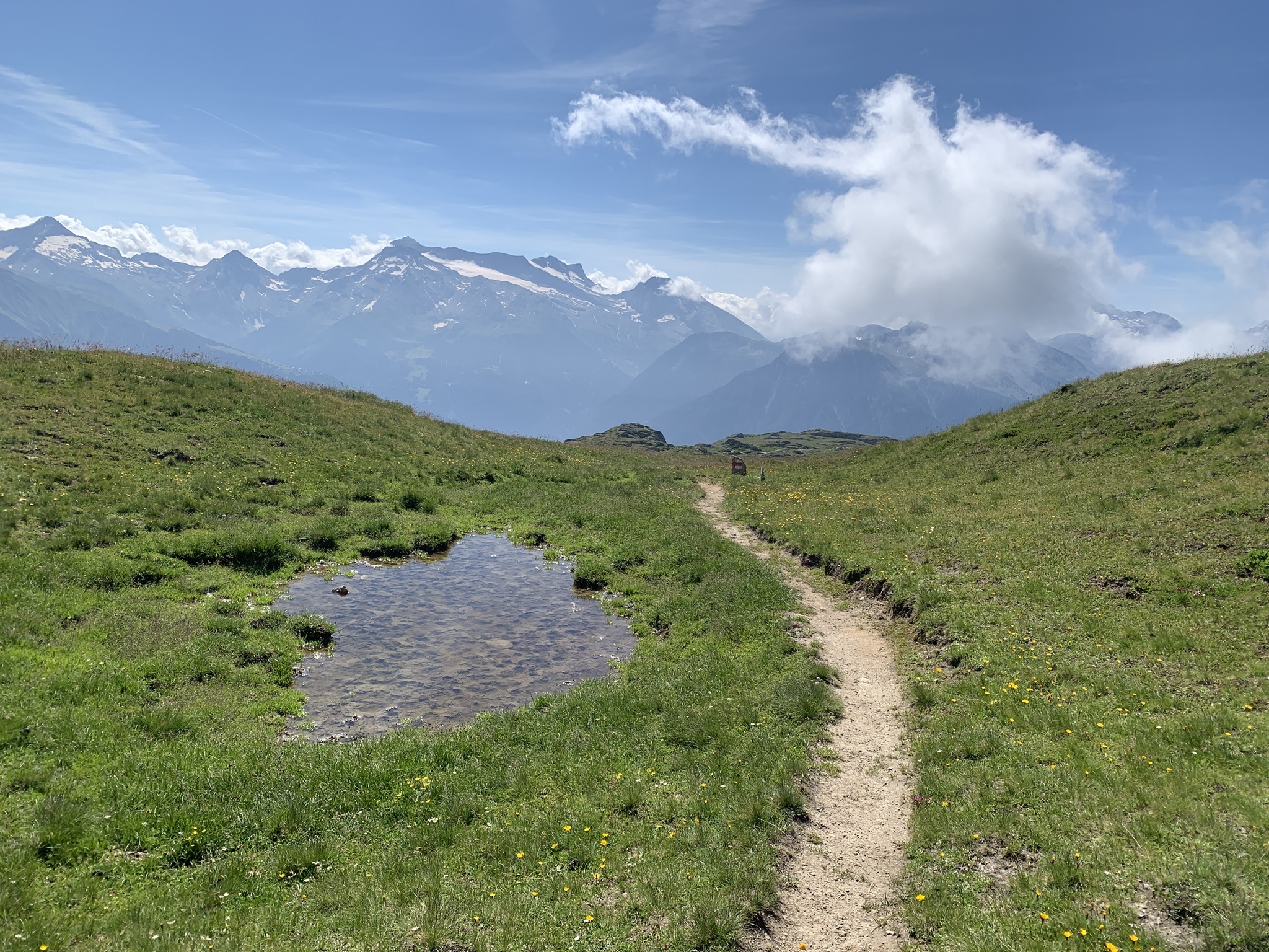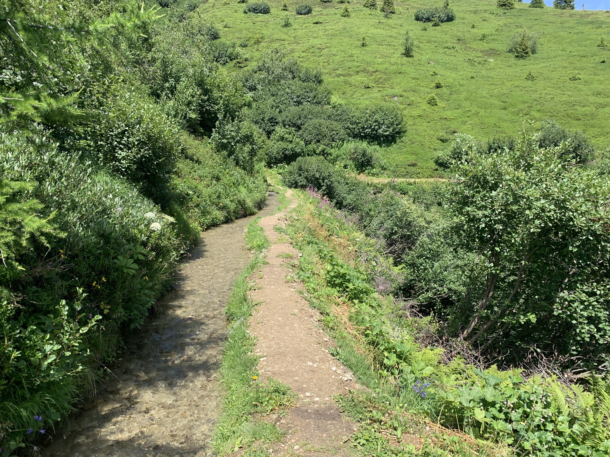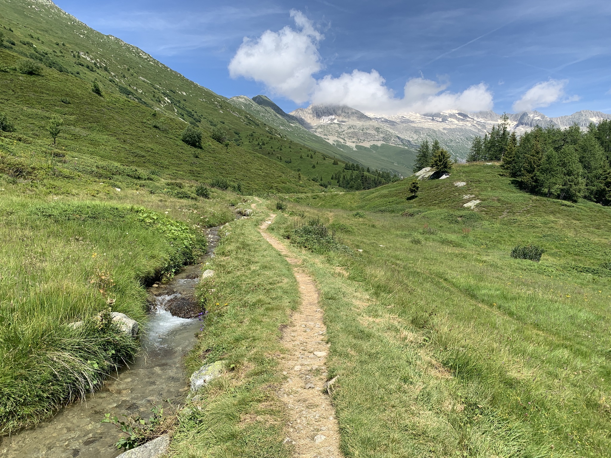 Von hier geht es dann hinunter bis fast nach Nessel. Hier wählte ich den Weg an der Nessjeri-Suone entlang. Es geht immer sanft hinauf.