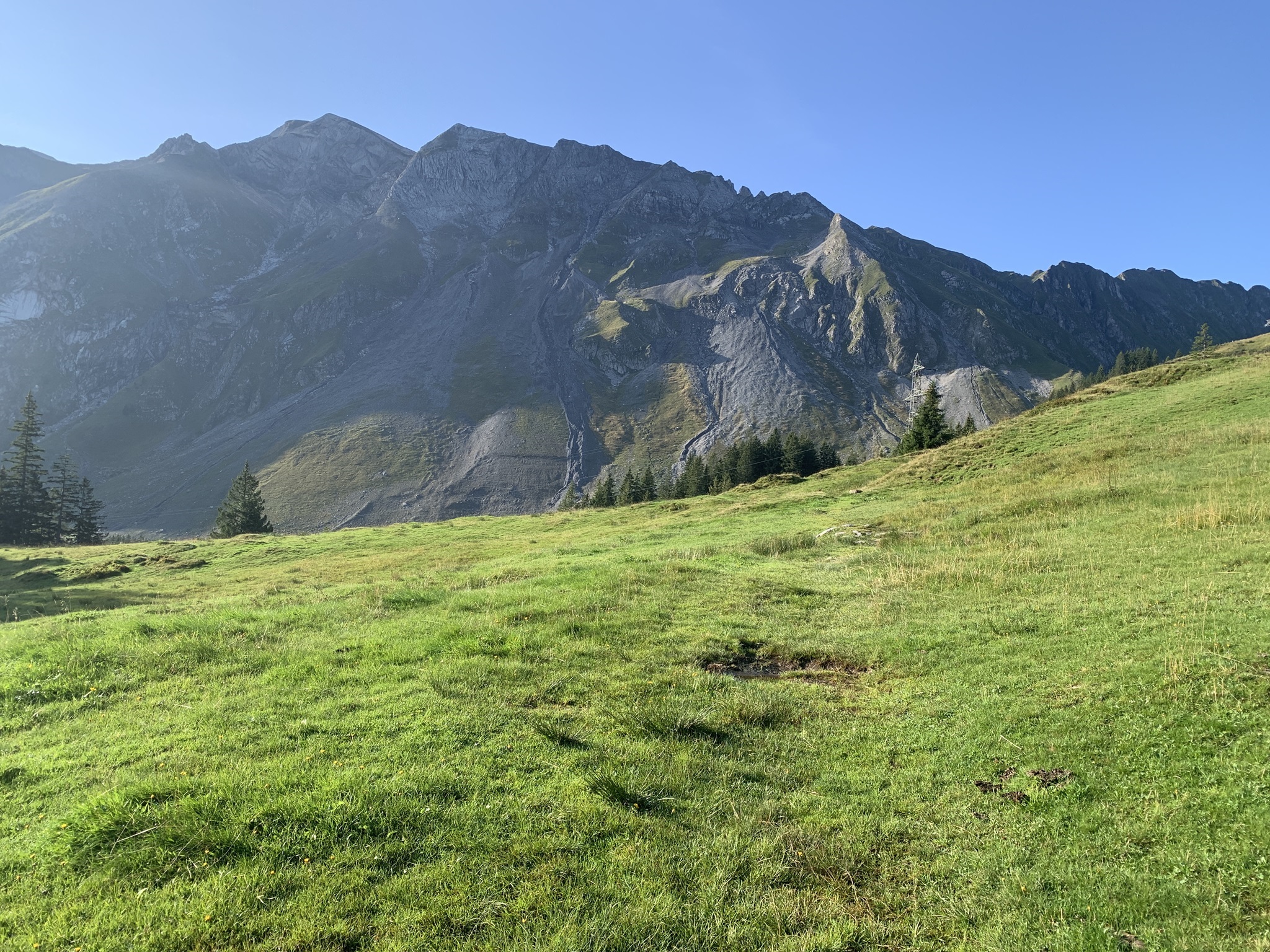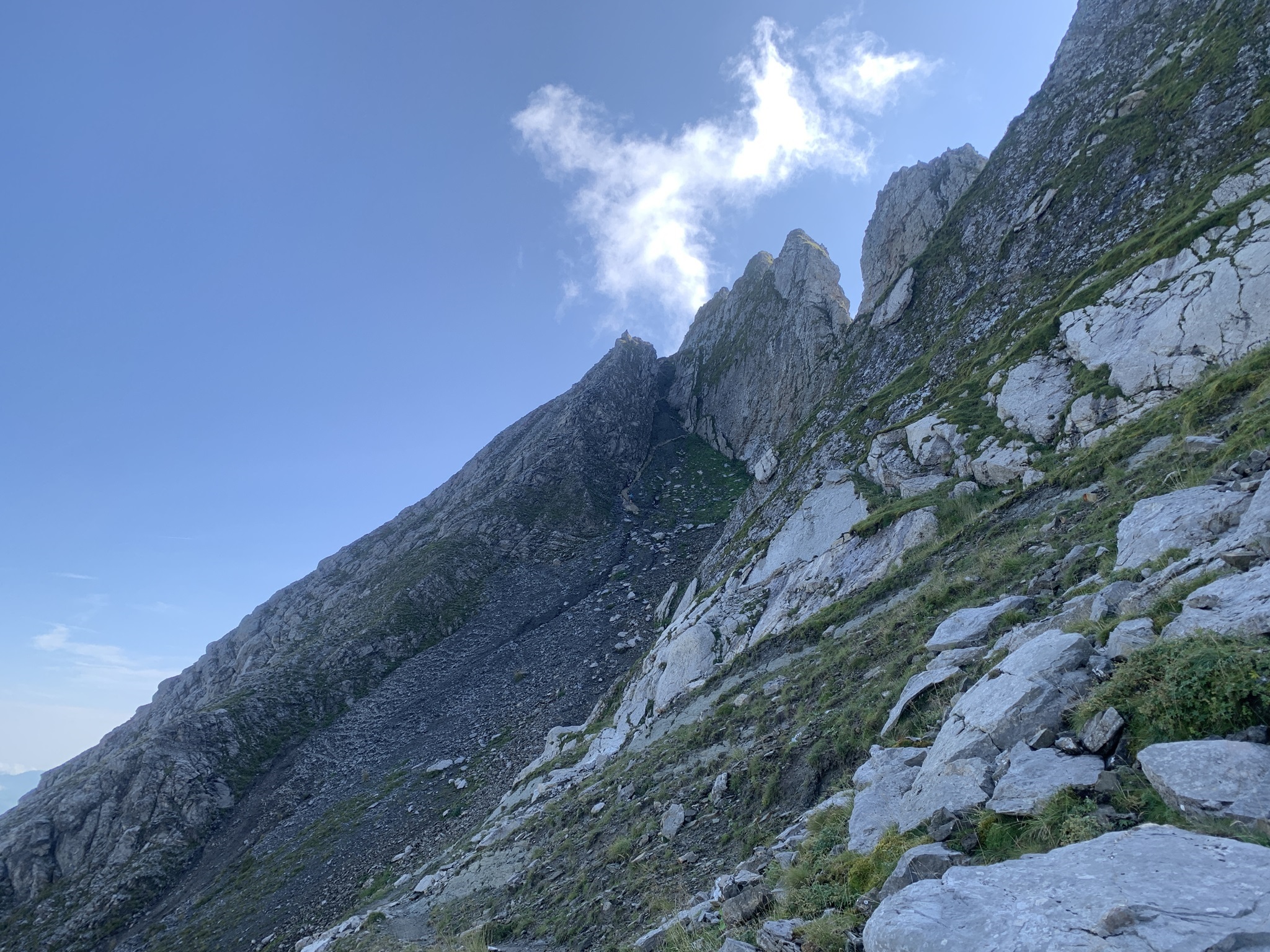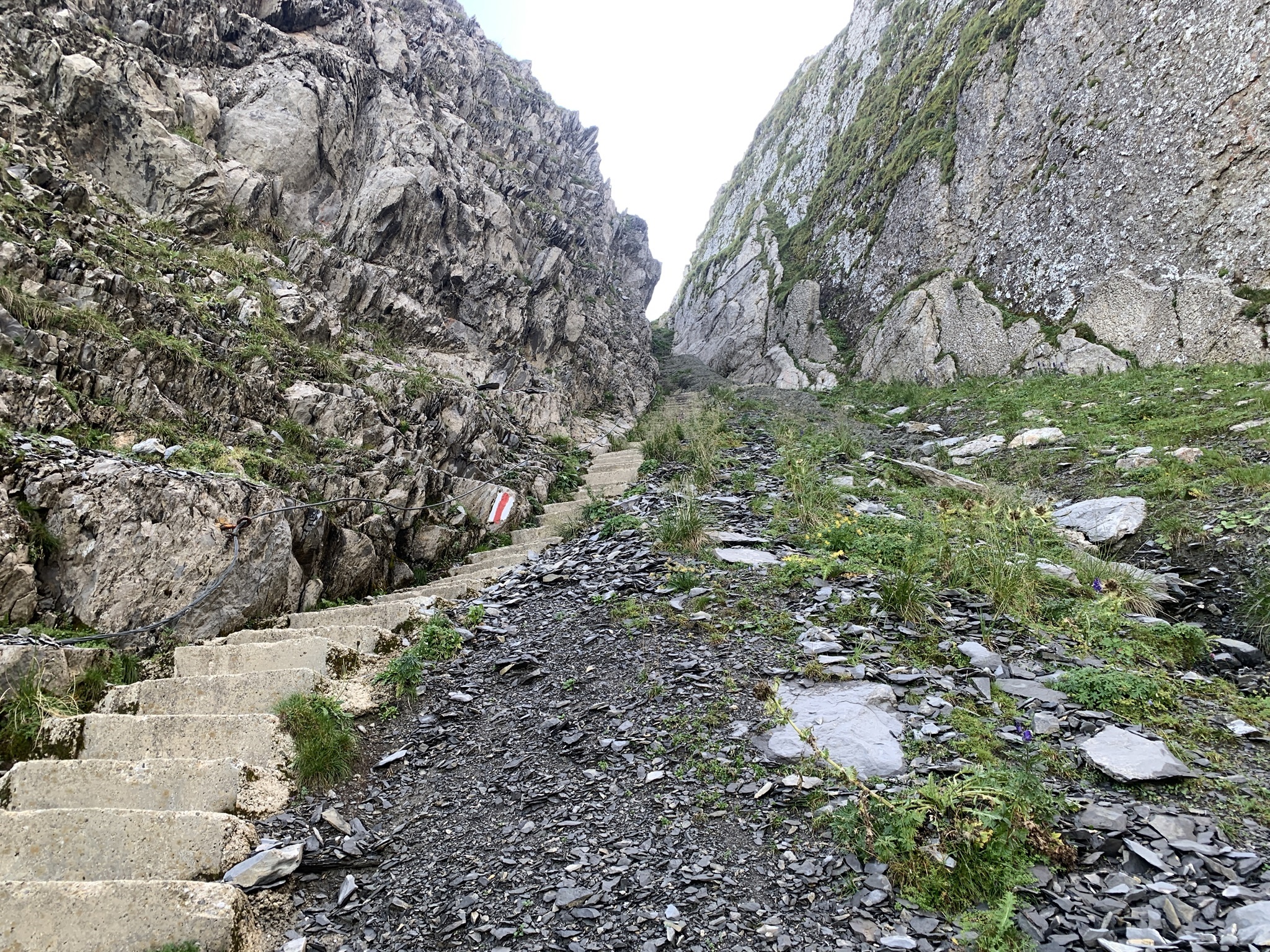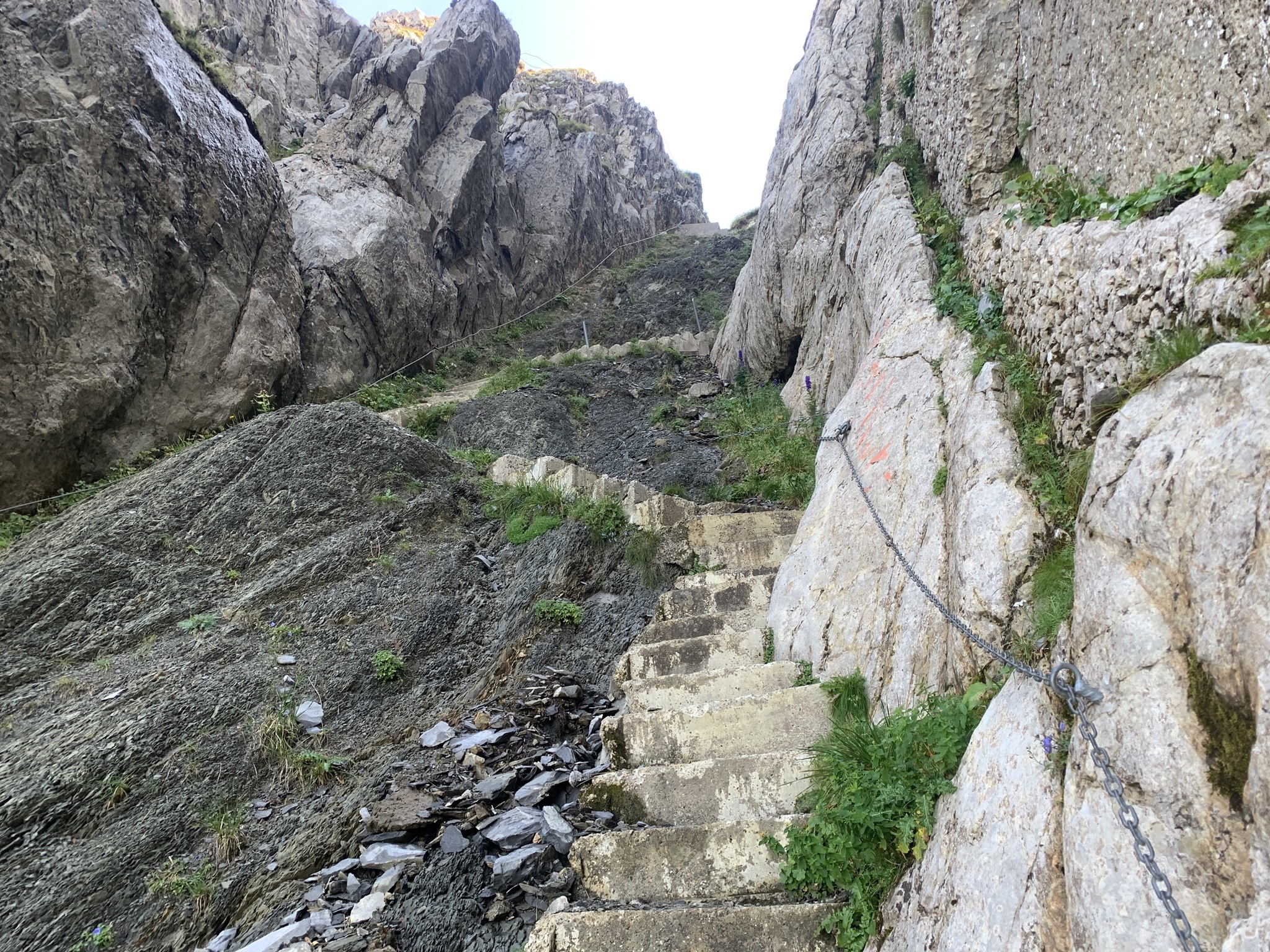 Aber danach geht es sehr sehr steil Aufwärts. Zuerst über Wiesen, die wegen dem Gewitter am Vorabend sehr rutschig waren. Weiter geht es zur Chrutere. Hier sieht man schon auf das Lättgässli. Eine schmale und steile Schuttrinne die zwischen den Felsen hindurch geht. Gesichert durch Ketten und ein betonierte Treppe.