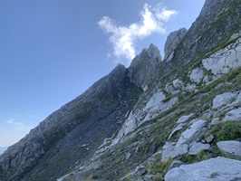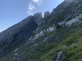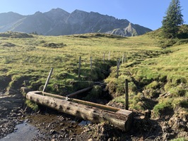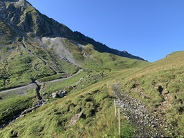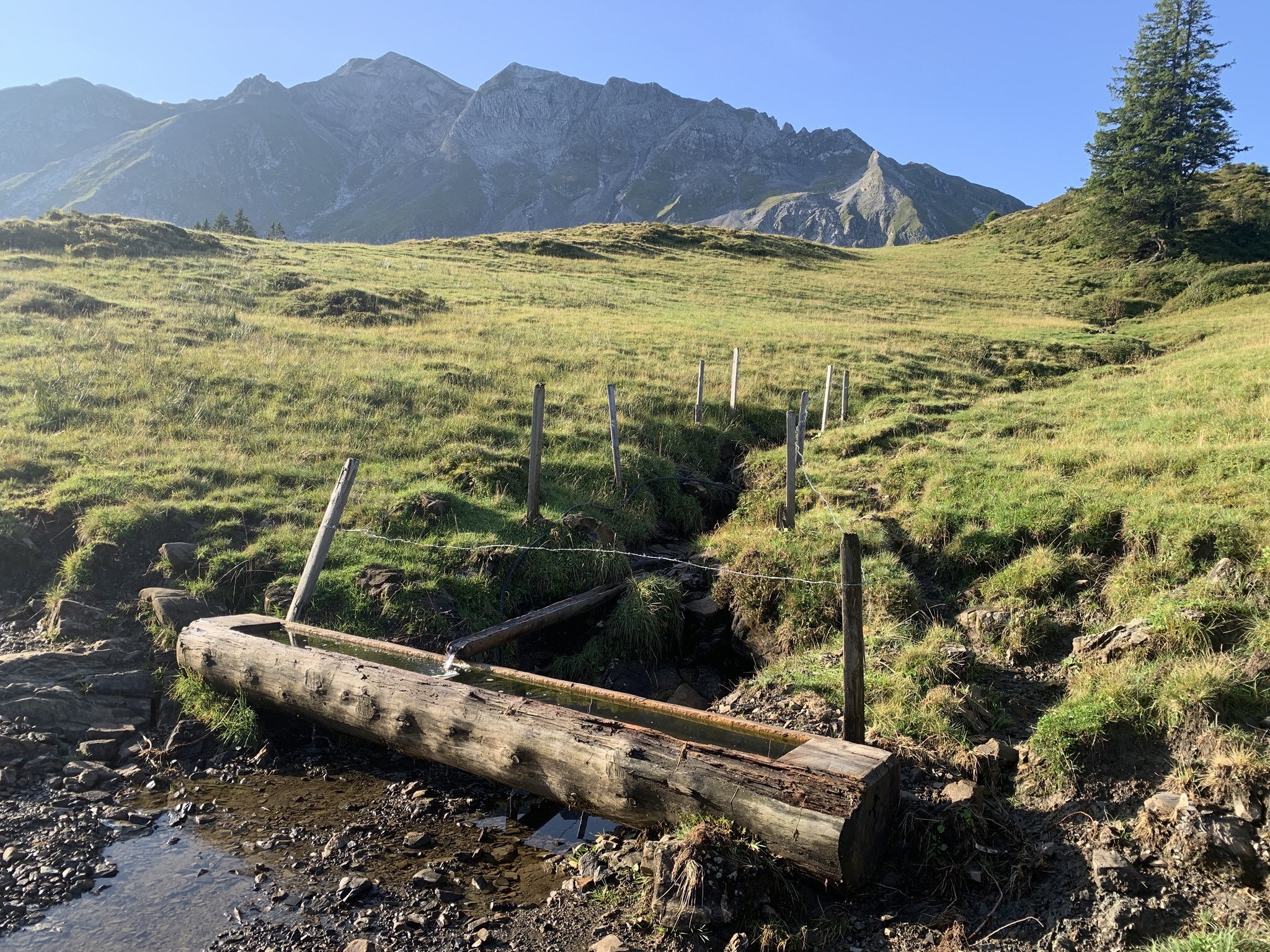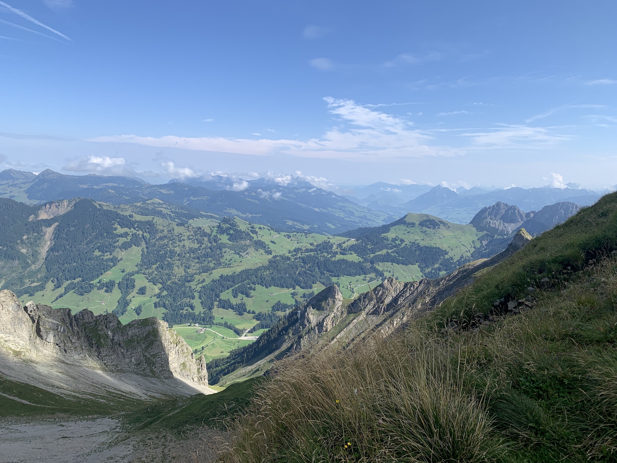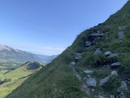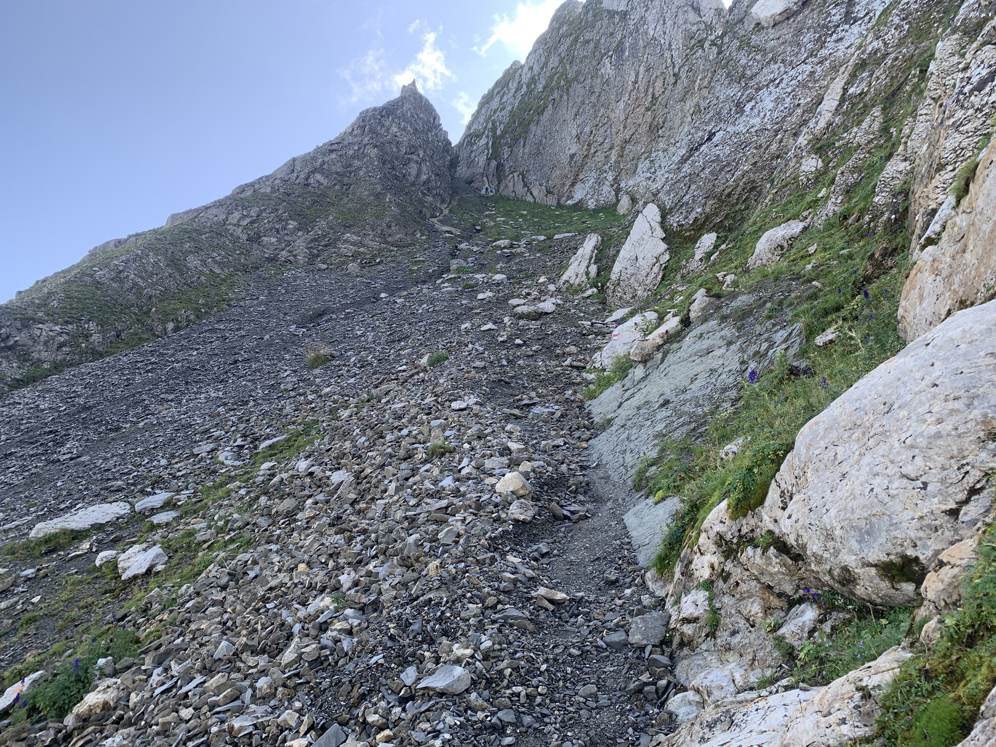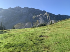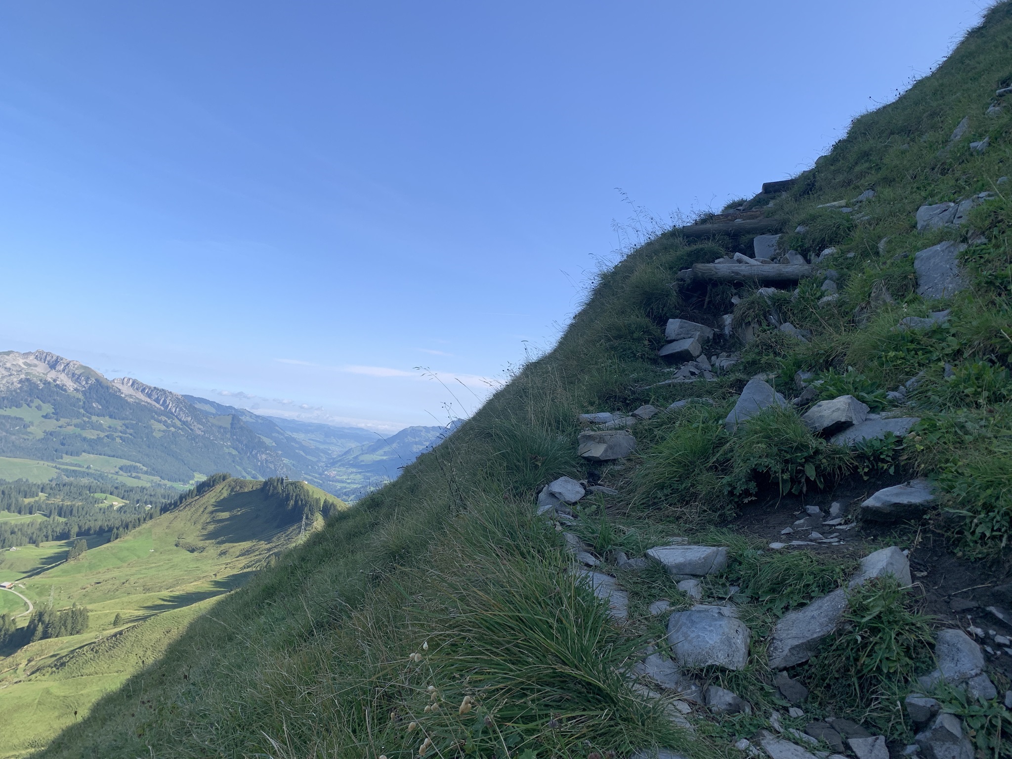 Aber danach geht es sehr sehr steil Aufwärts. Zuerst über Wiesen, die wegen dem Gewitter am Vorabend sehr rutschig waren. Weiter geht es zur Chrutere. Hier sieht man schon auf das Lättgässli. Eine schmale und steile Schuttrinne die zwischen den Felsen hindurch geht. Gesichert durch Ketten und ein betonierte Treppe.