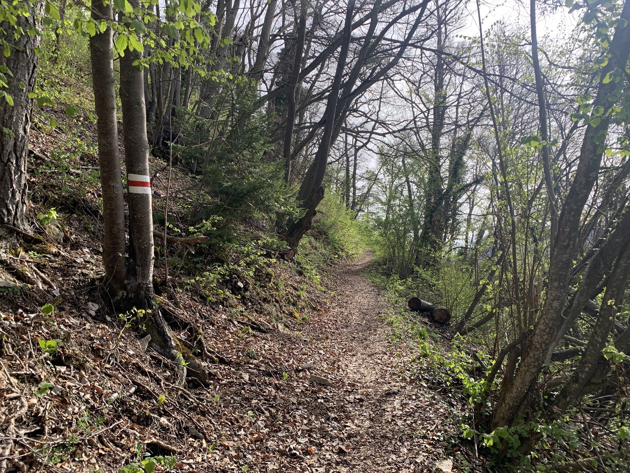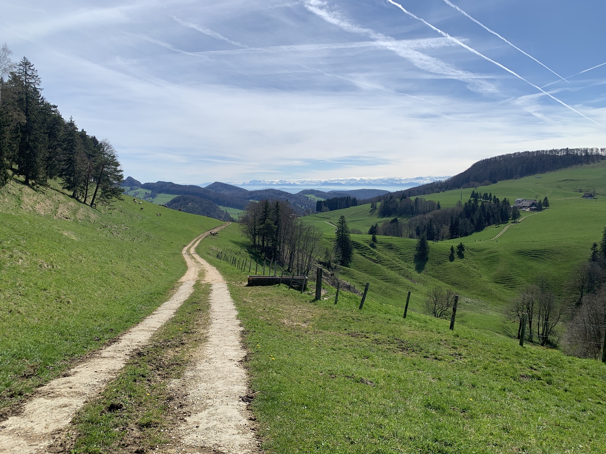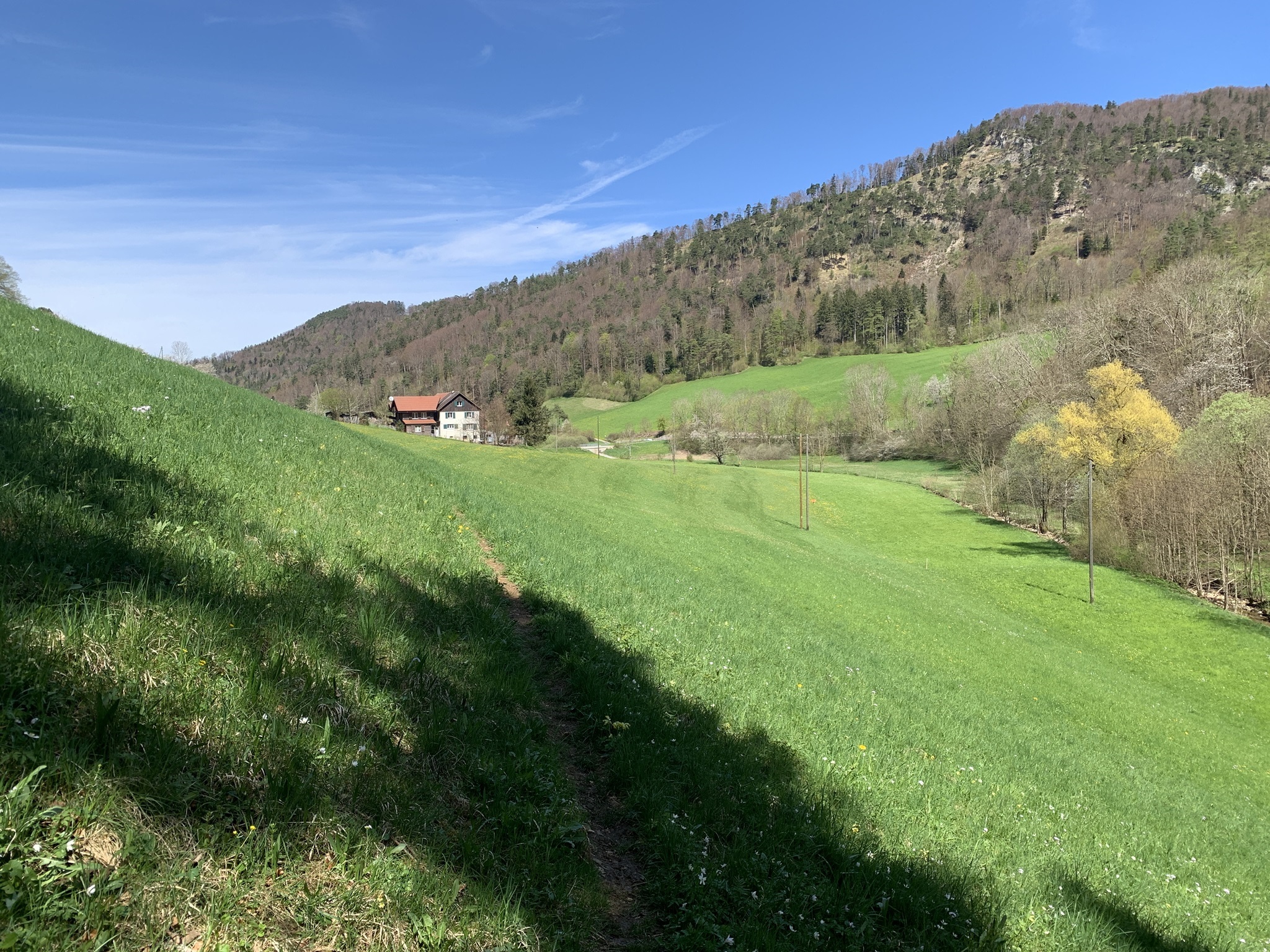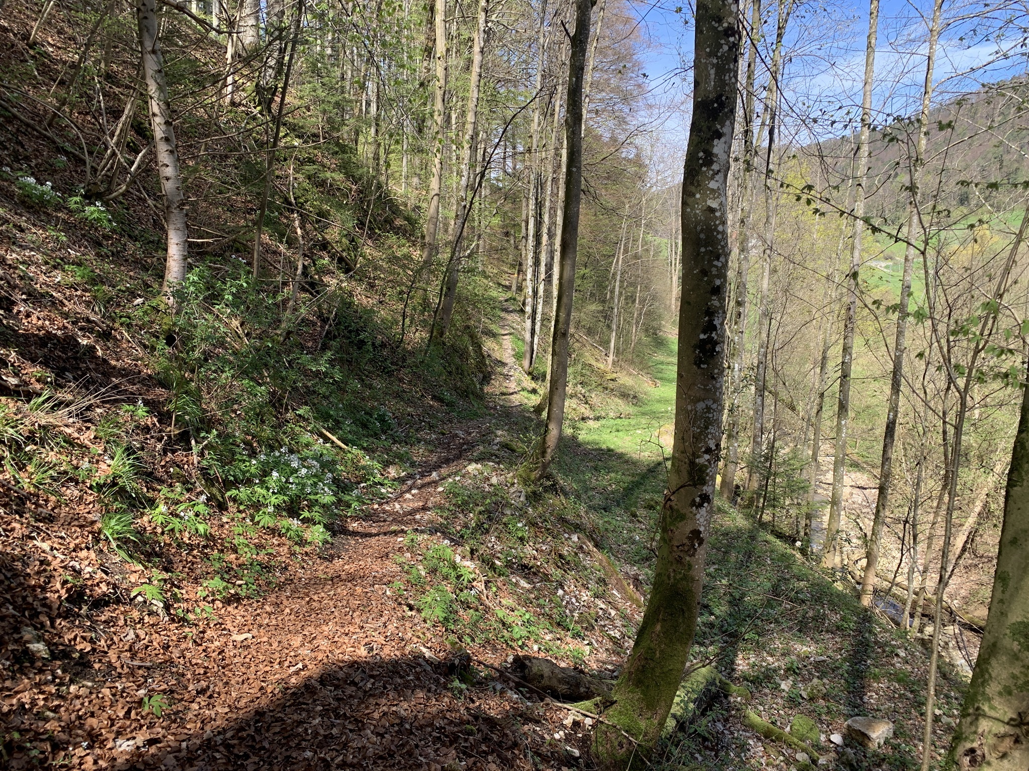Zuerst geht es auf Hartbelag durch das Dorf und hinauf Richtung RIchtifluh. Aber schon bald zweigt der Weg rechts ab und es geht auf einem Gebirgswanderweg über die Richtifluh. Schon bald hat man einen schönen Blick in das Tal. Der Weg führt über Den Grat über Steine und Wurzeln.