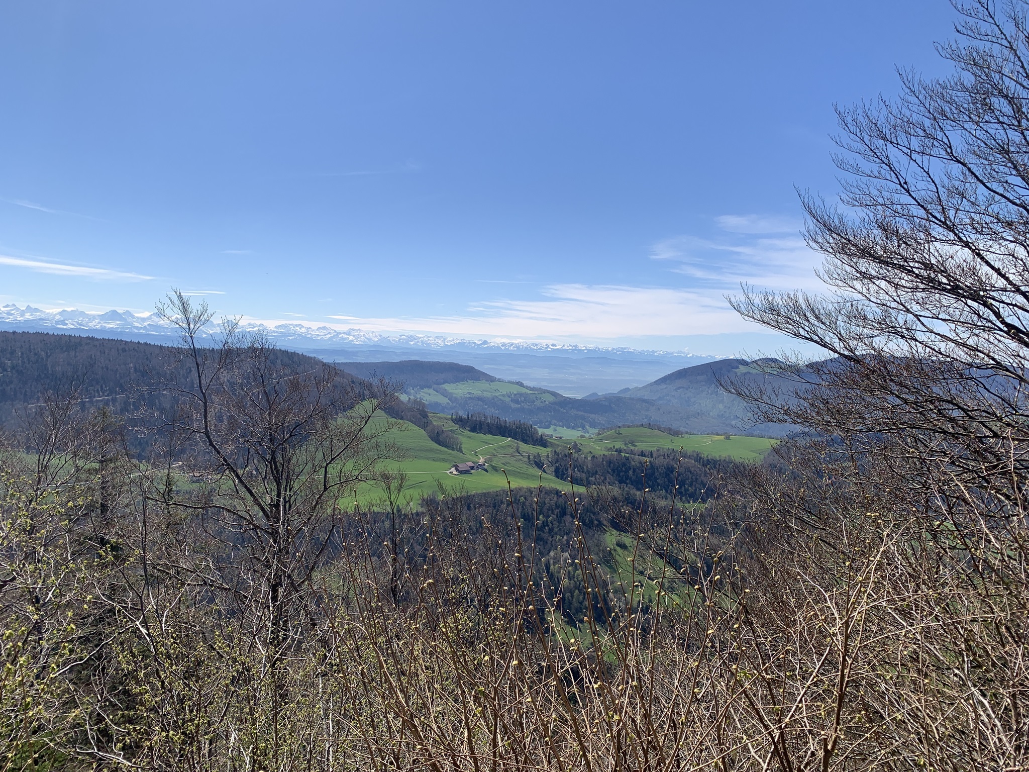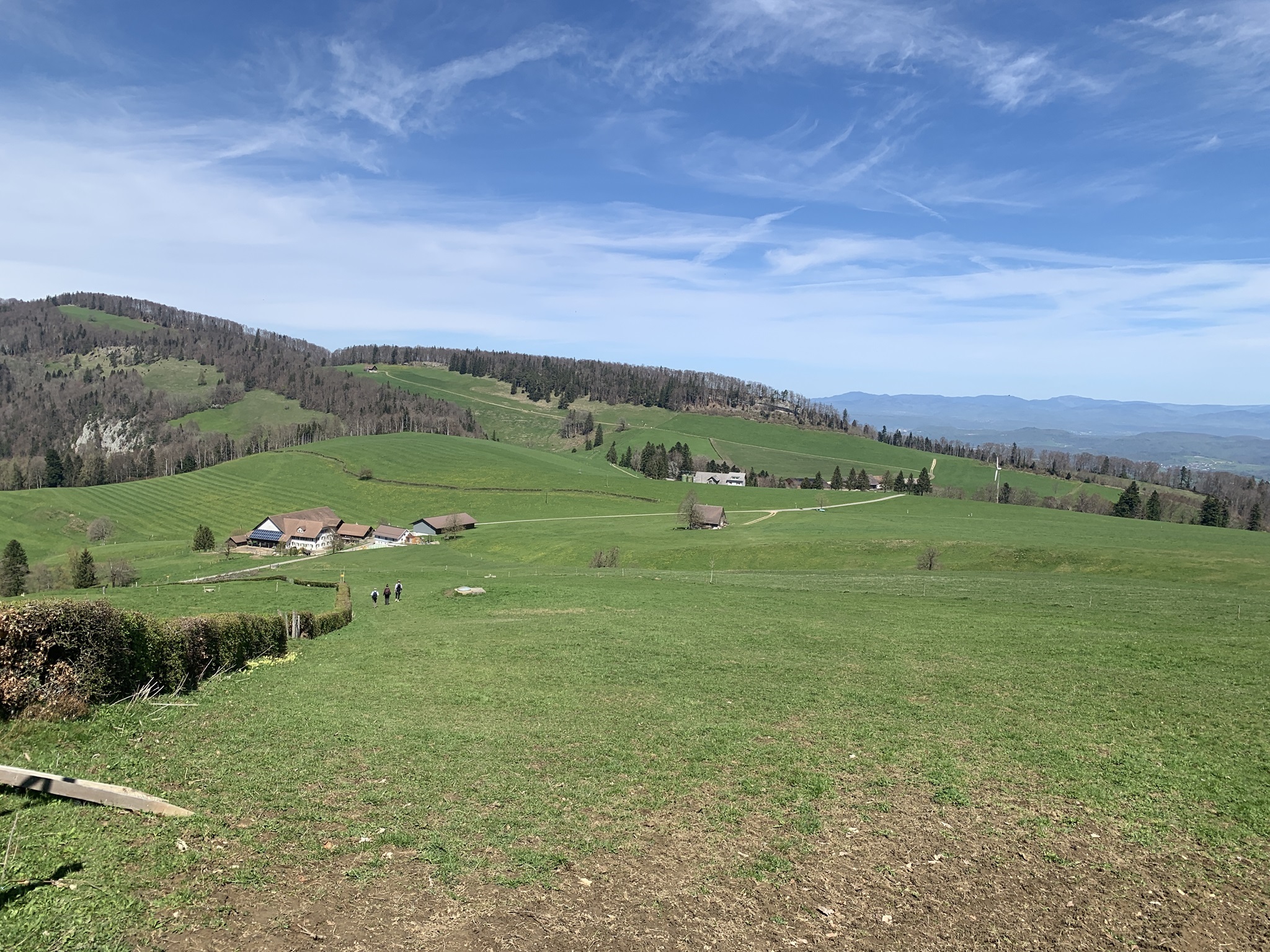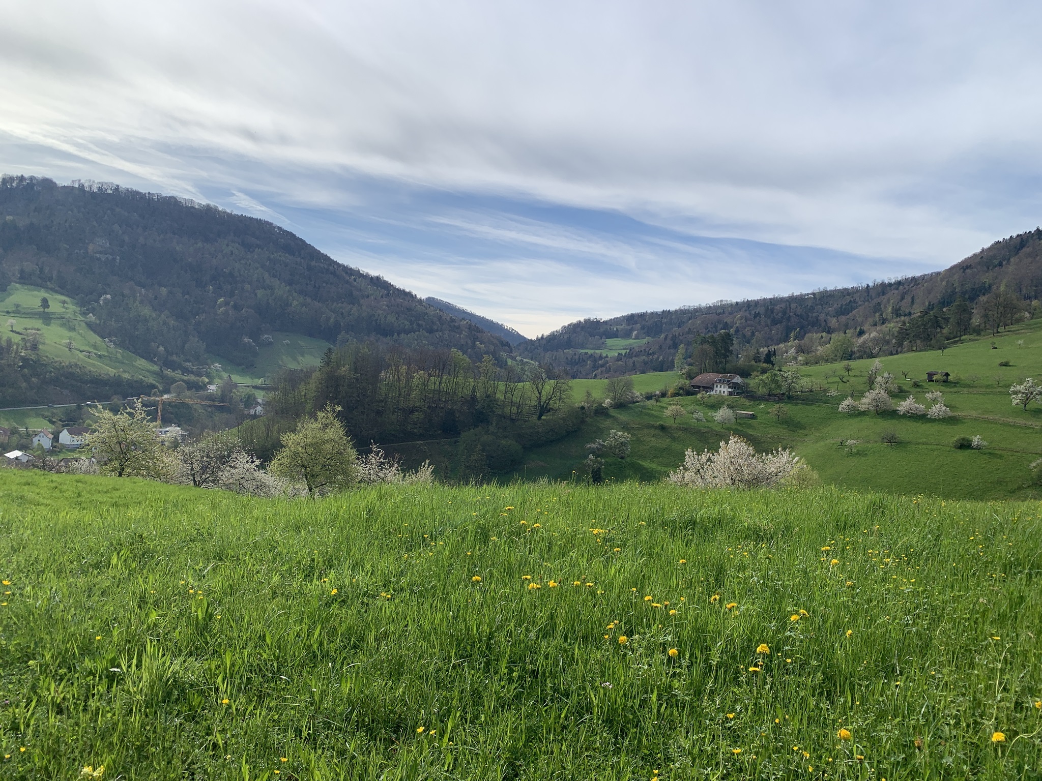 Zuerst geht es auf Hartbelag durch das Dorf und hinauf Richtung RIchtifluh. Aber schon bald zweigt der Weg rechts ab und es geht auf einem Gebirgswanderweg über die Richtifluh. Schon bald hat man einen schönen Blick in das Tal. Der Weg führt über Den Grat über Steine und Wurzeln.