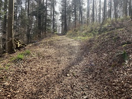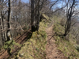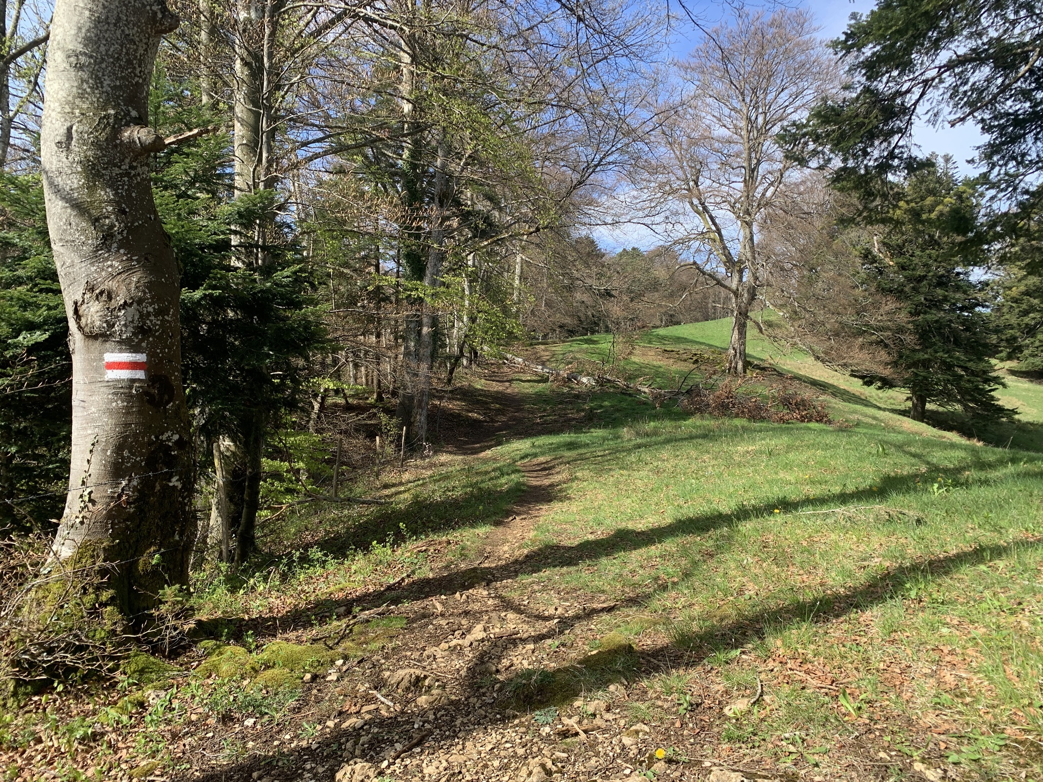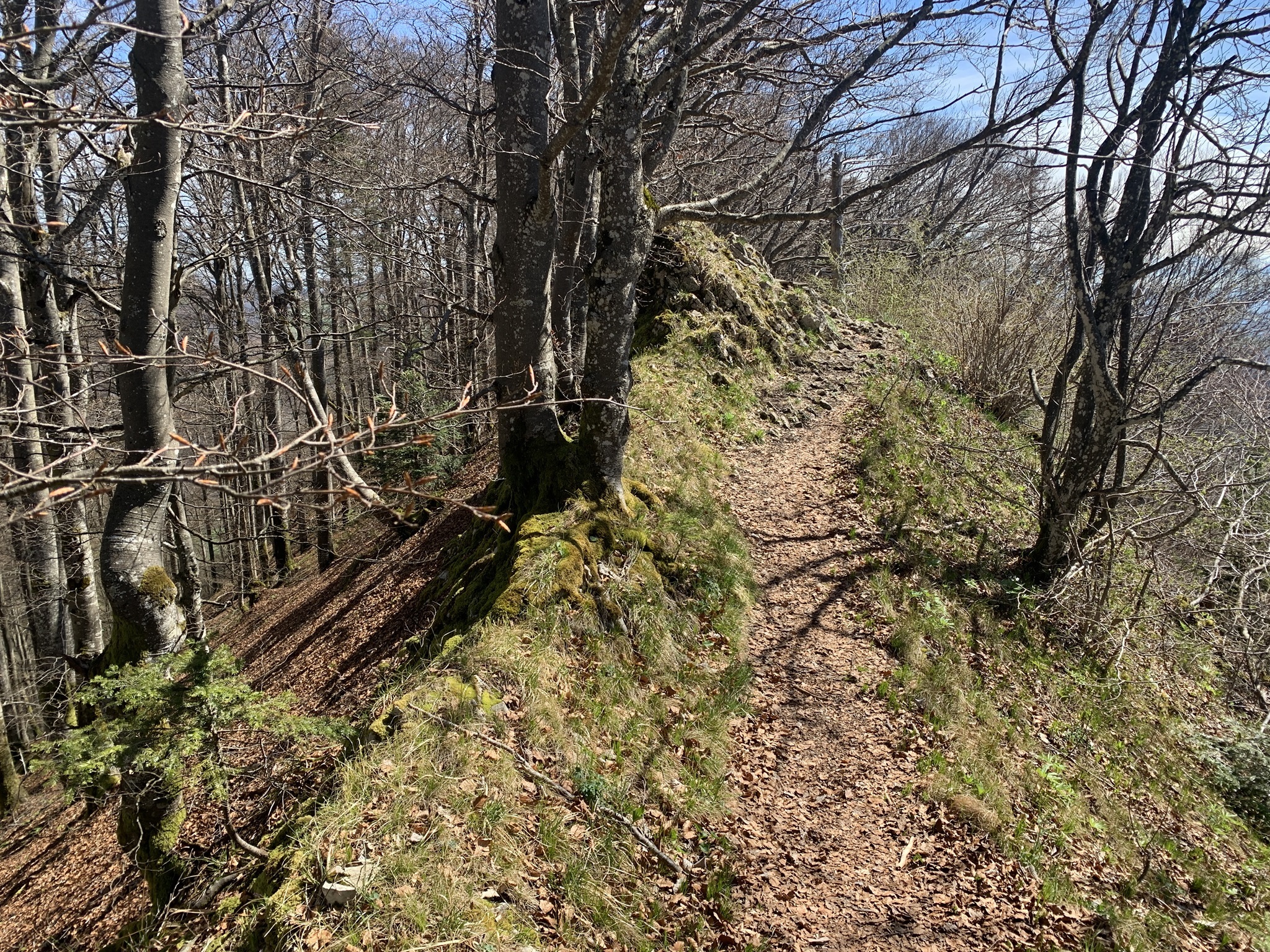 Jetzt geht es noch einmal über eine Wiese Richtung Bilsteinberg. Aber schon bald kommt man in den Wald und es folgt wiederum ein Gratweg.