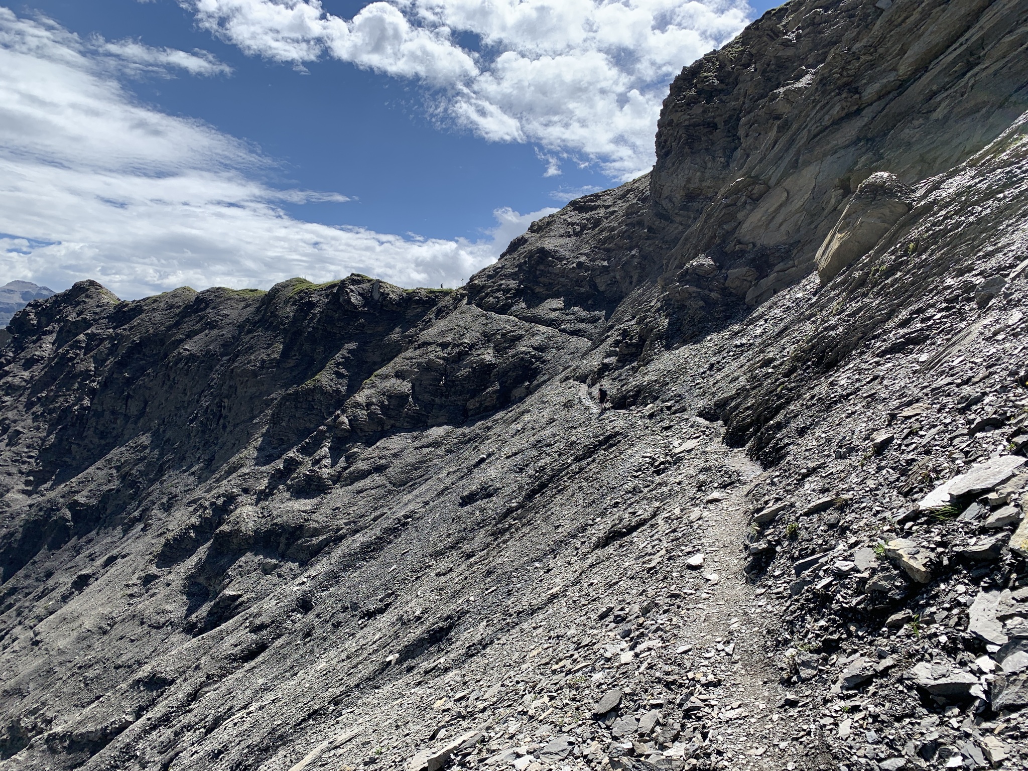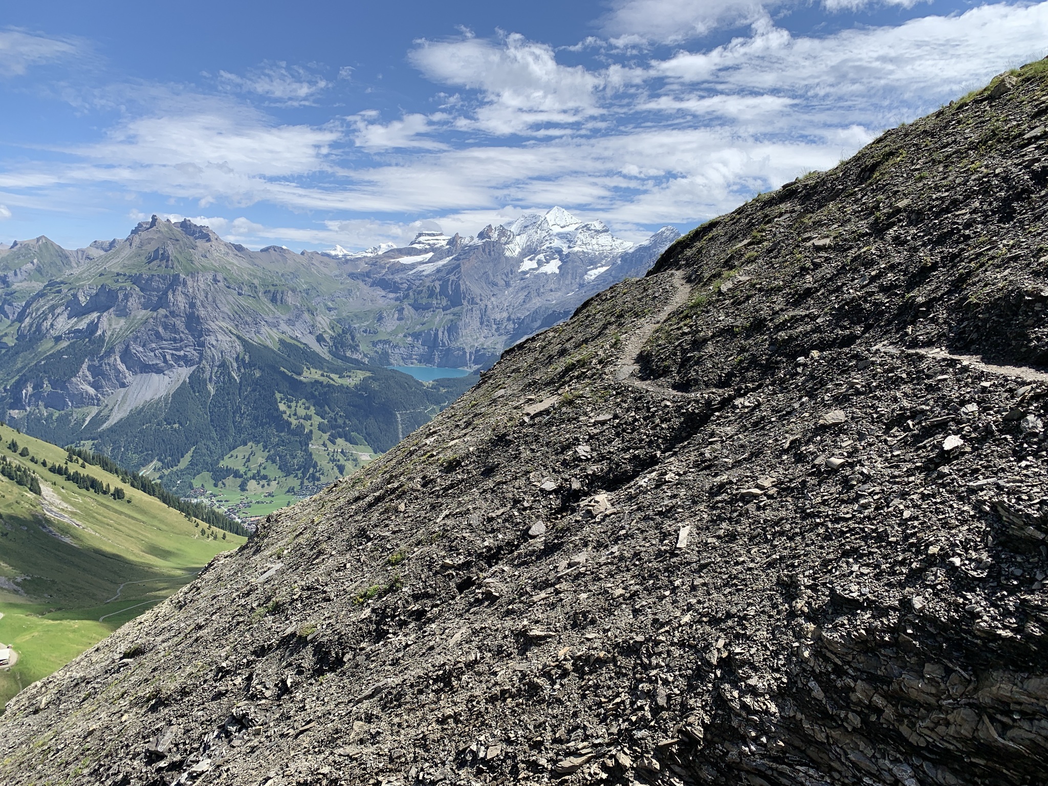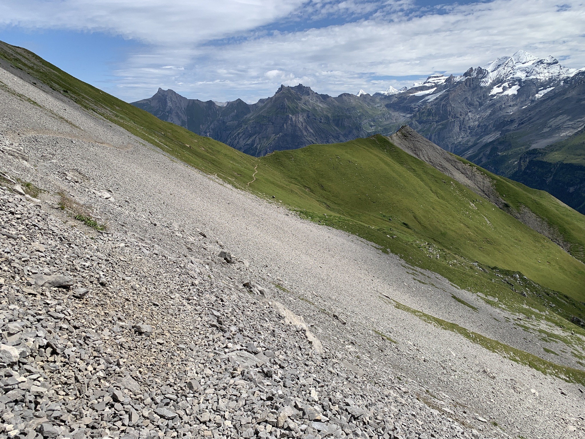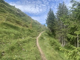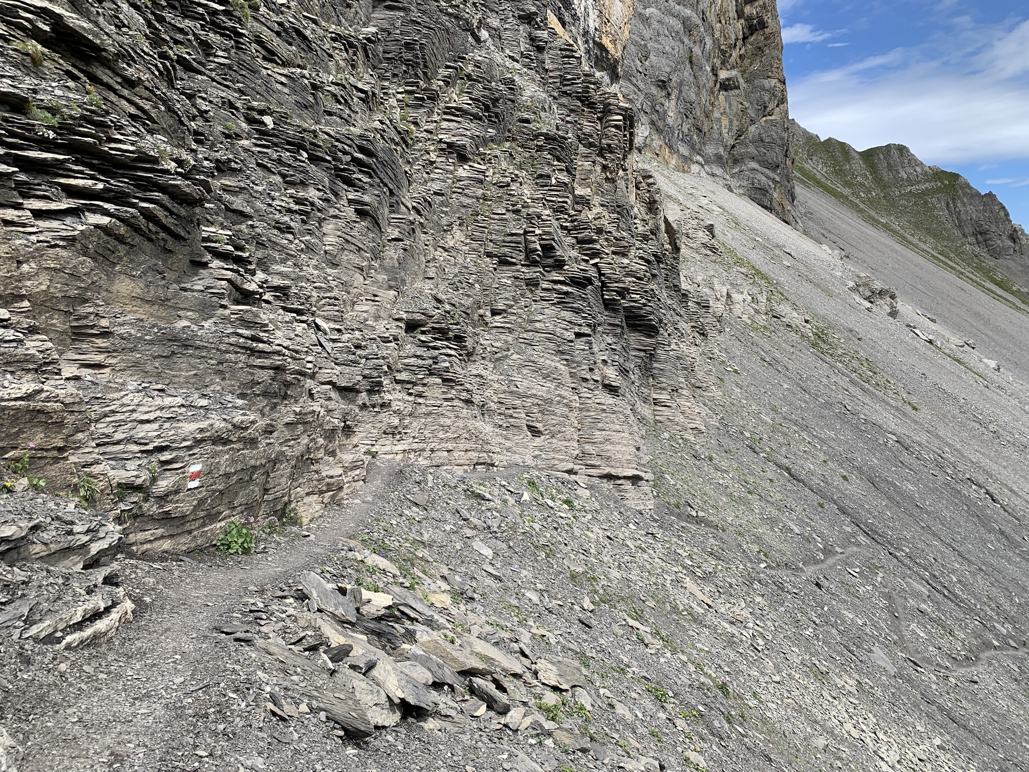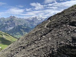 Beim Abstieg geht es zuerst wieder recht steil hinunter. Danach folgt ab dem Alpscheidgrat ein recht ausgesetzter Wegabschnitt. Ist aber mit Ketten gut gesichert. Danach geht es auf Alpsträsschen hinter zur Allmenalp.