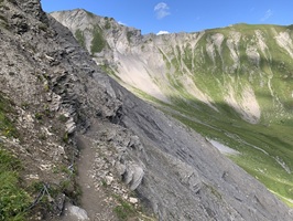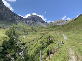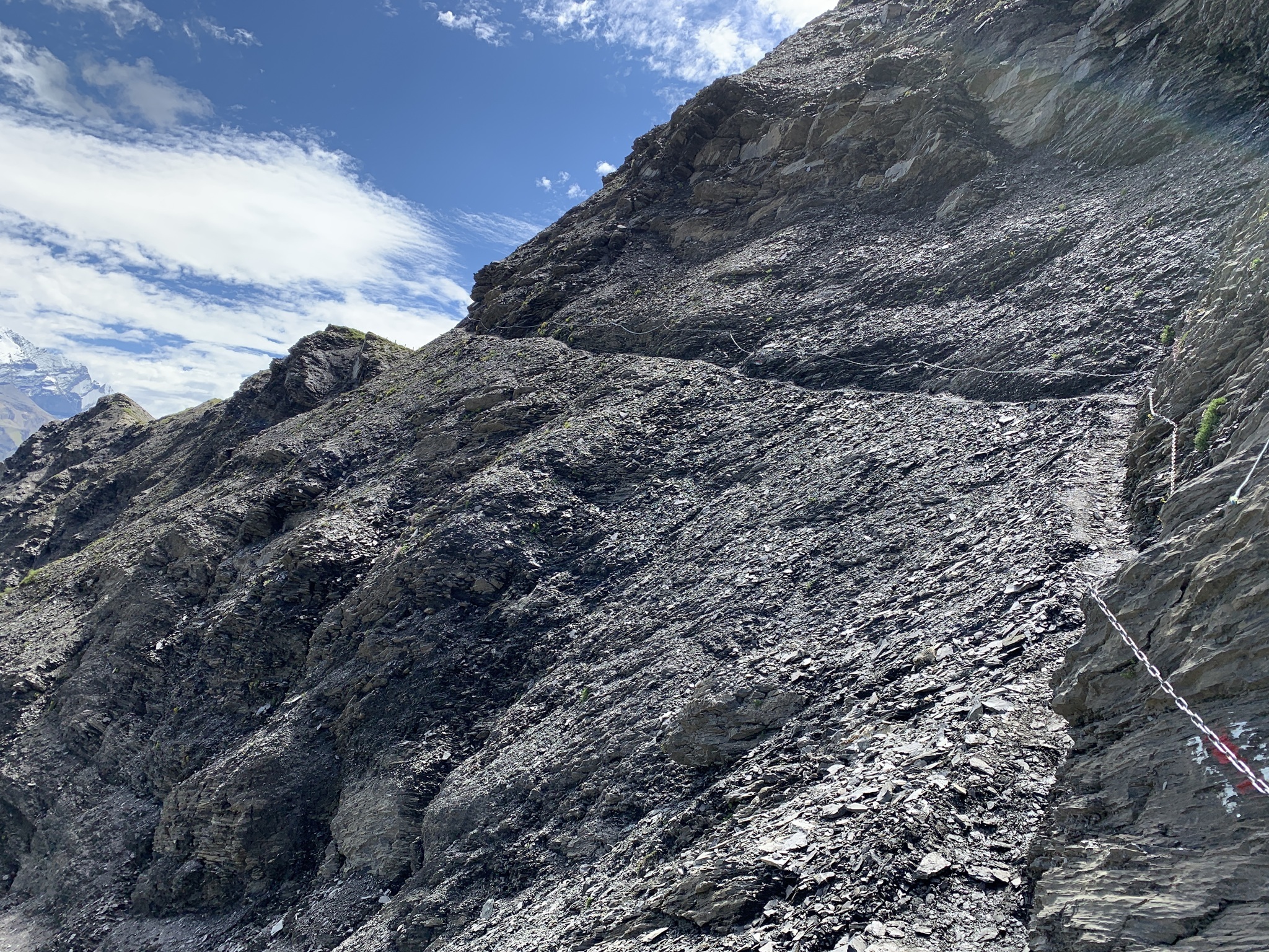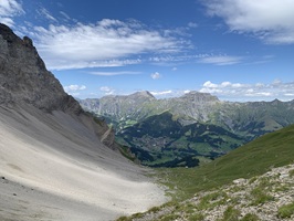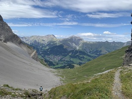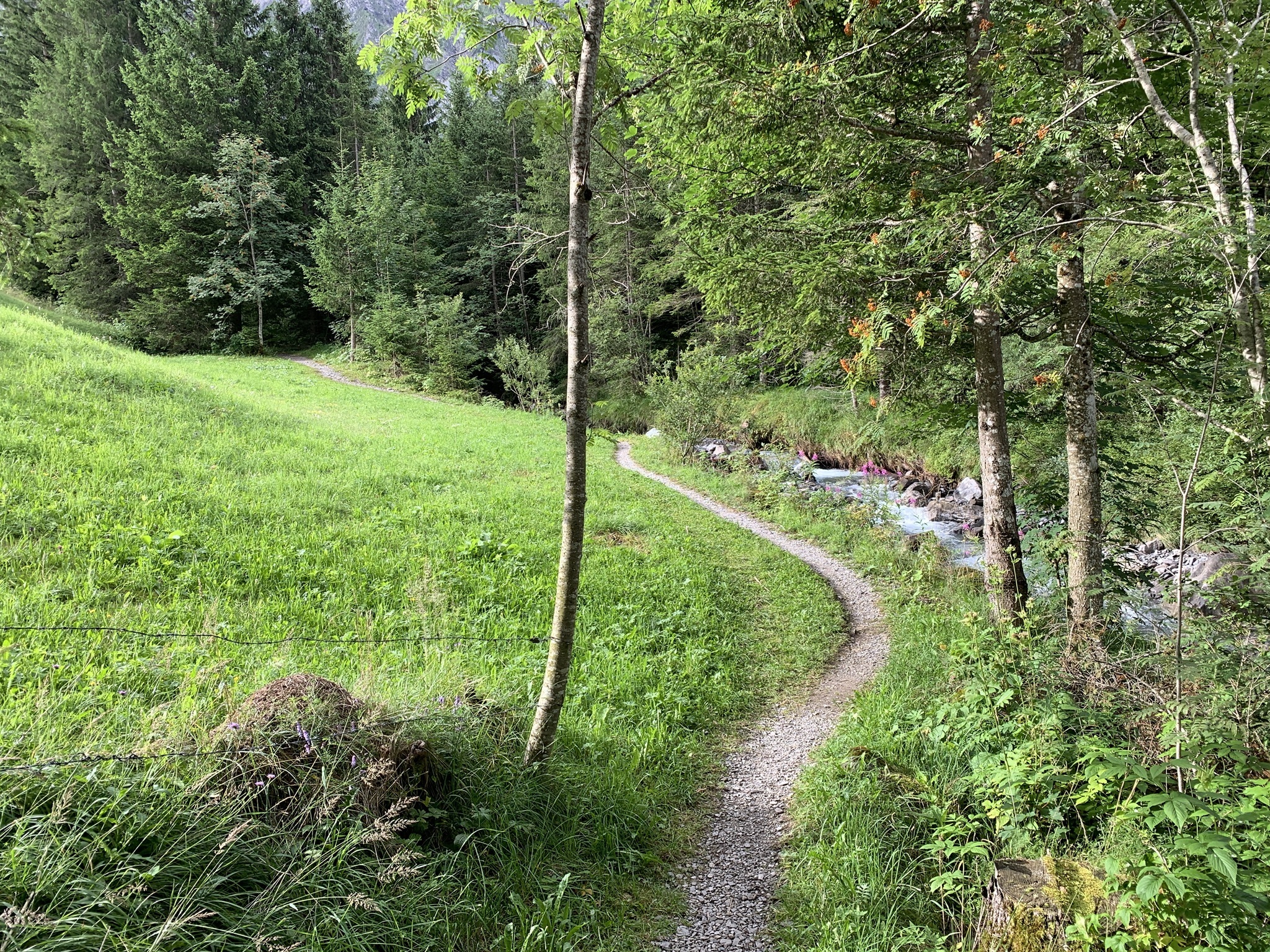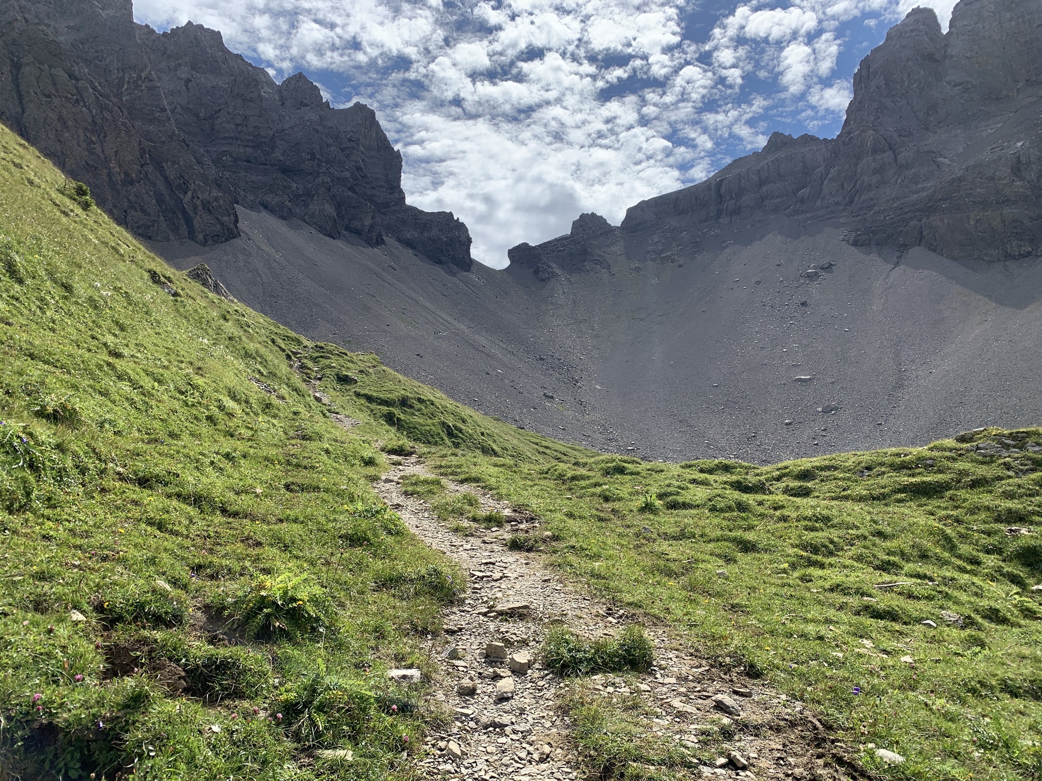 Beim Abstieg geht es zuerst wieder recht steil hinunter. Danach folgt ab dem Alpscheidgrat ein recht ausgesetzter Wegabschnitt. Ist aber mit Ketten gut gesichert. Danach geht es auf Alpsträsschen hinter zur Allmenalp.