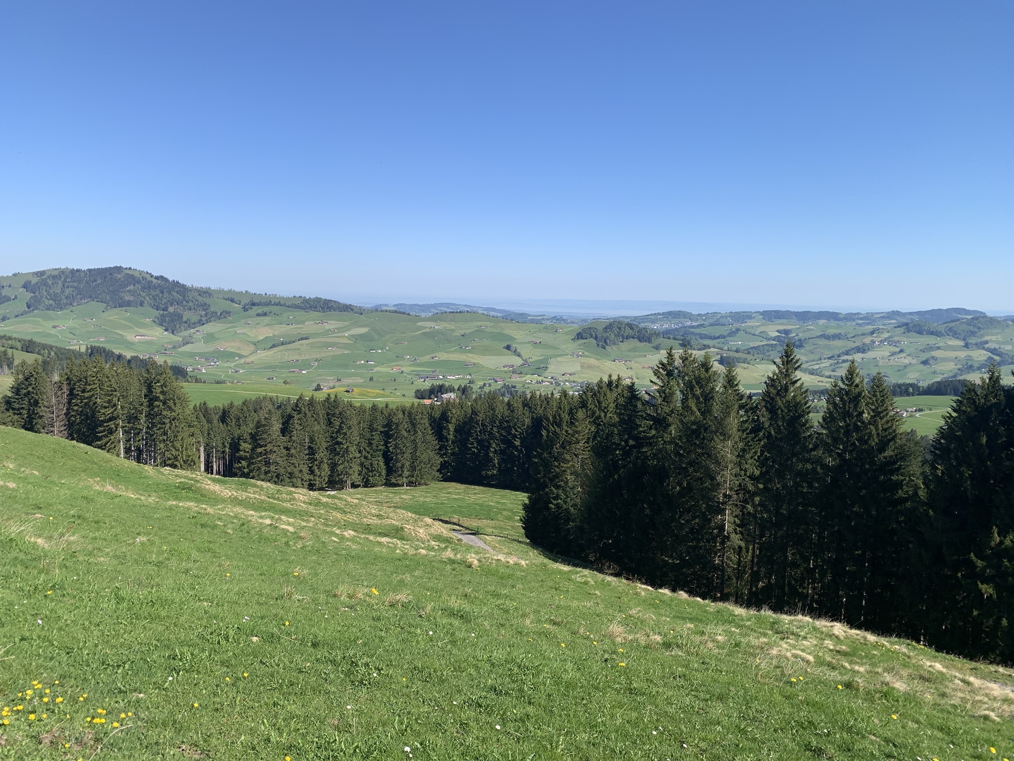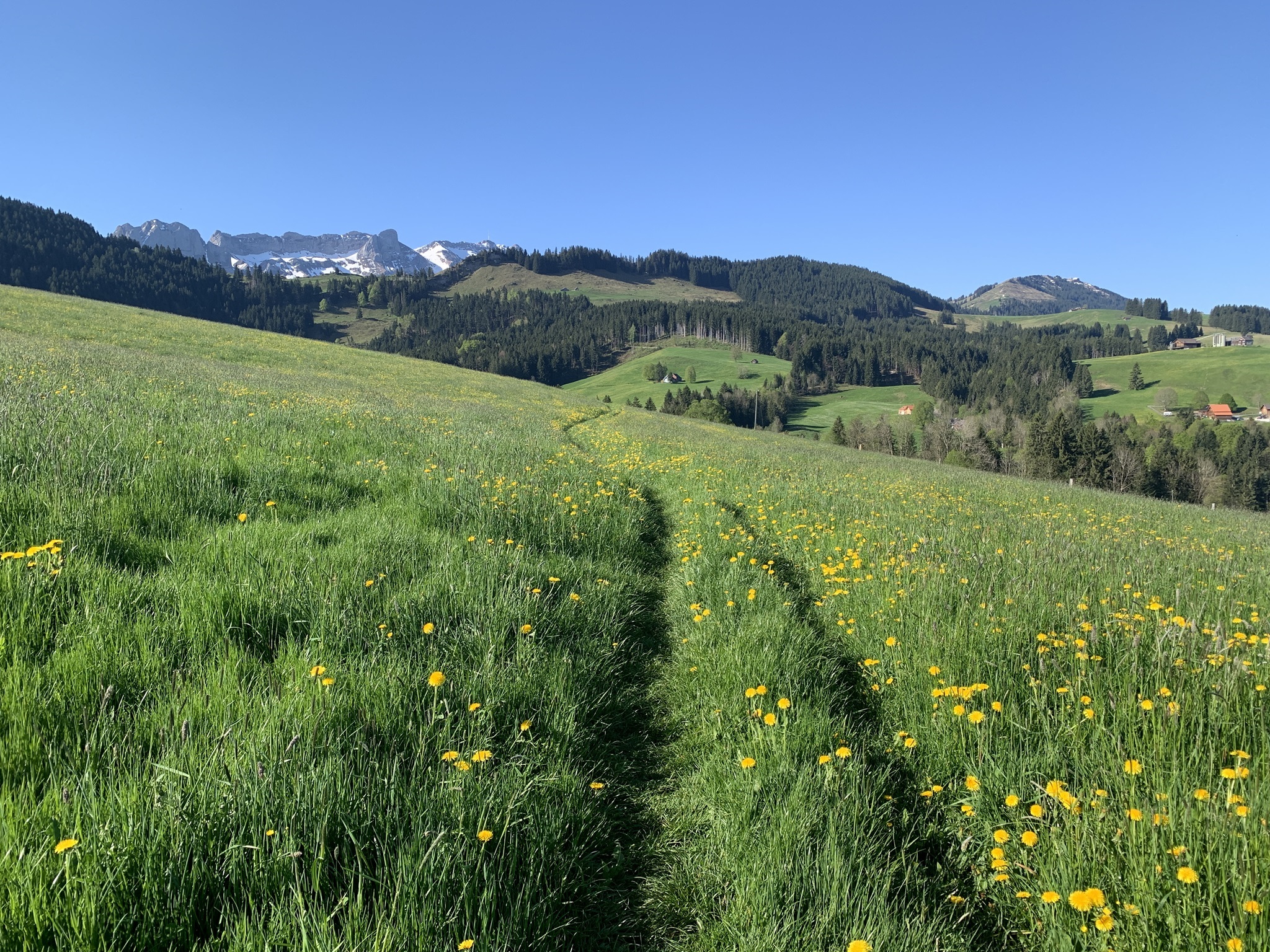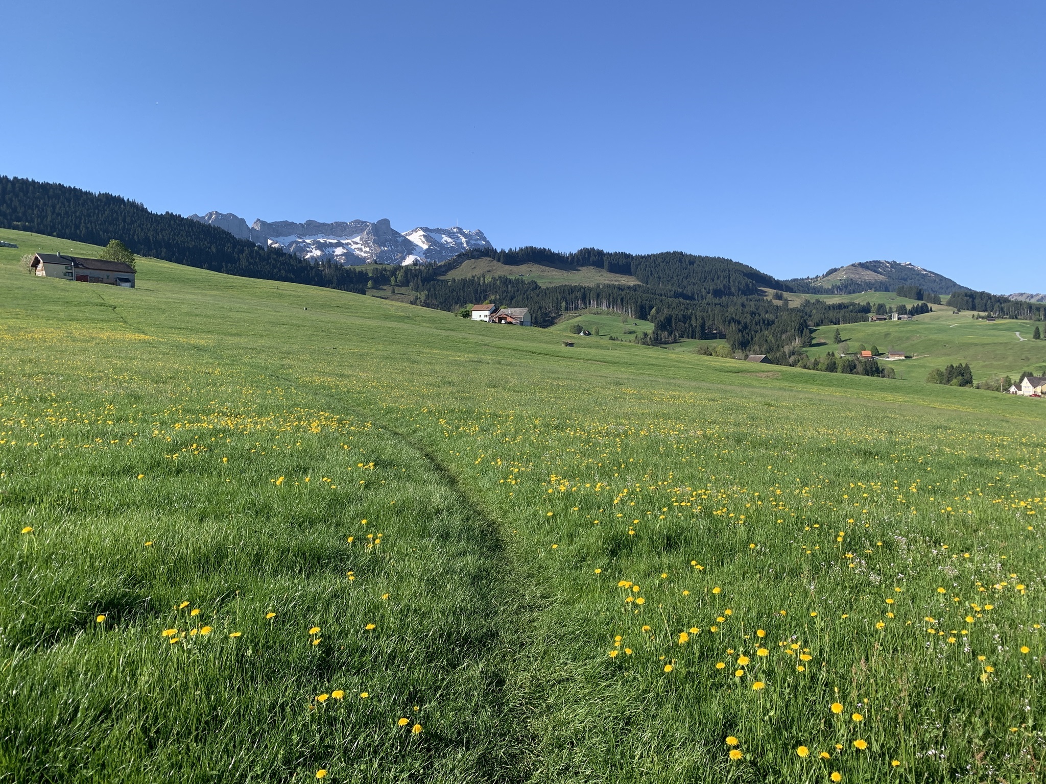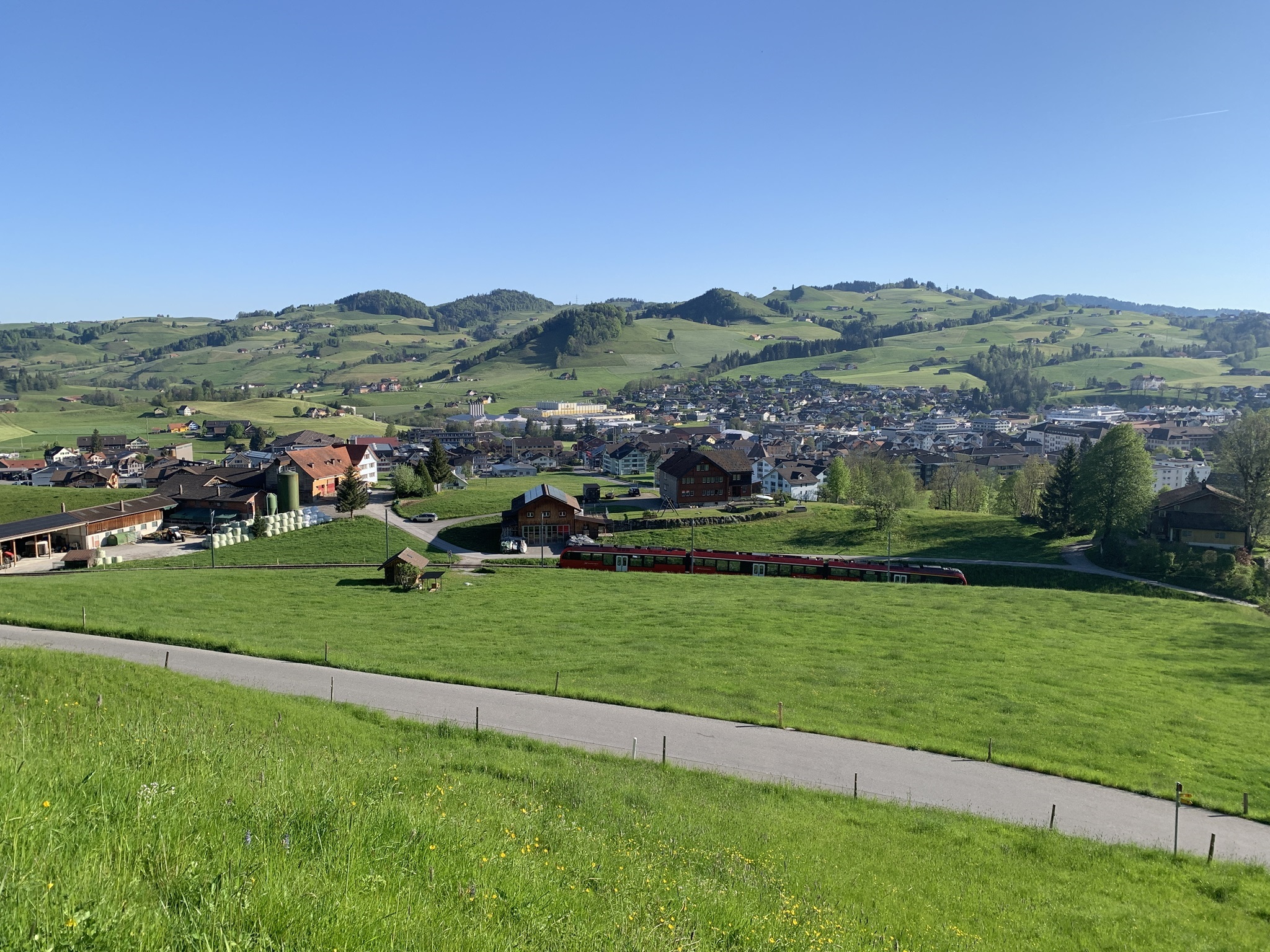 Zuerst geht es durch Appenzell, aber nach dem die Bahnlinie überquert ist geht steil durch einen Wald, danach über Wiesen zum sehr schön gelegenem Campingplatz Eischen. Schon hier sind die Weitblicke faszinierend!