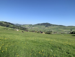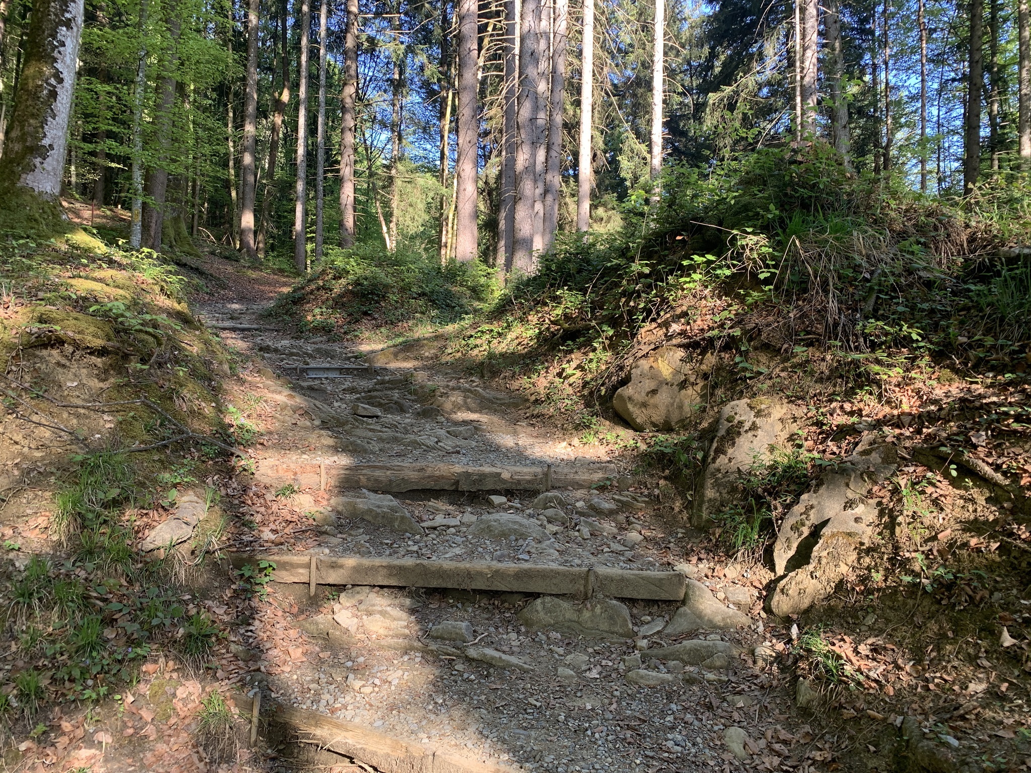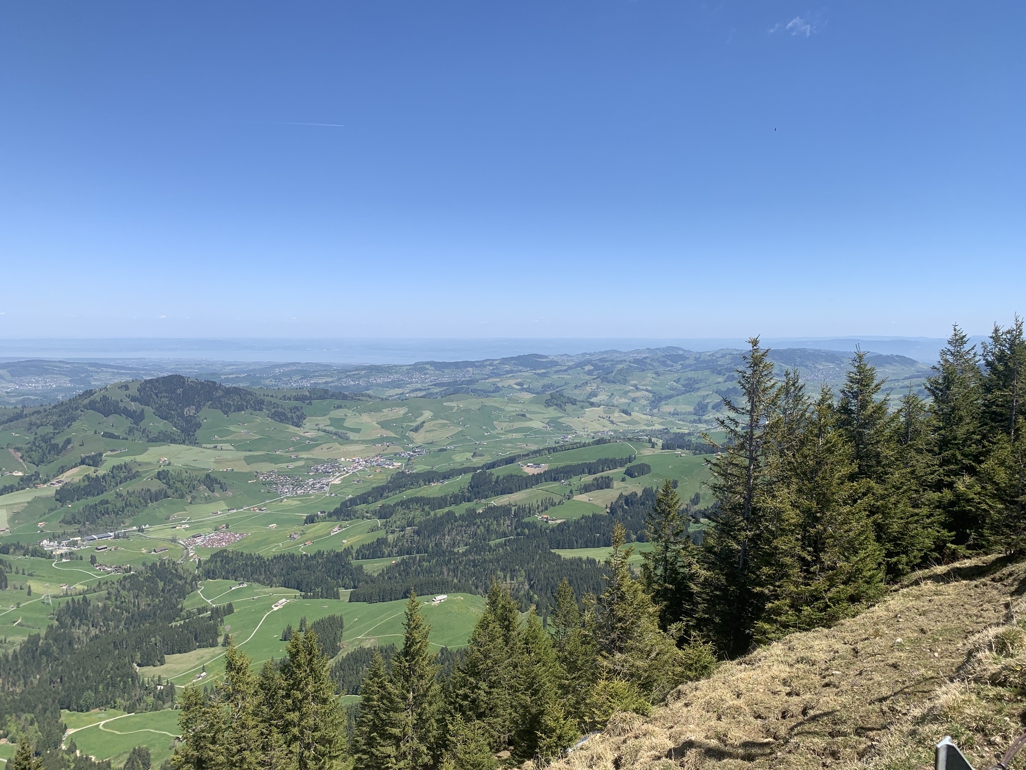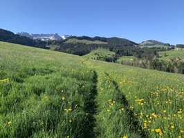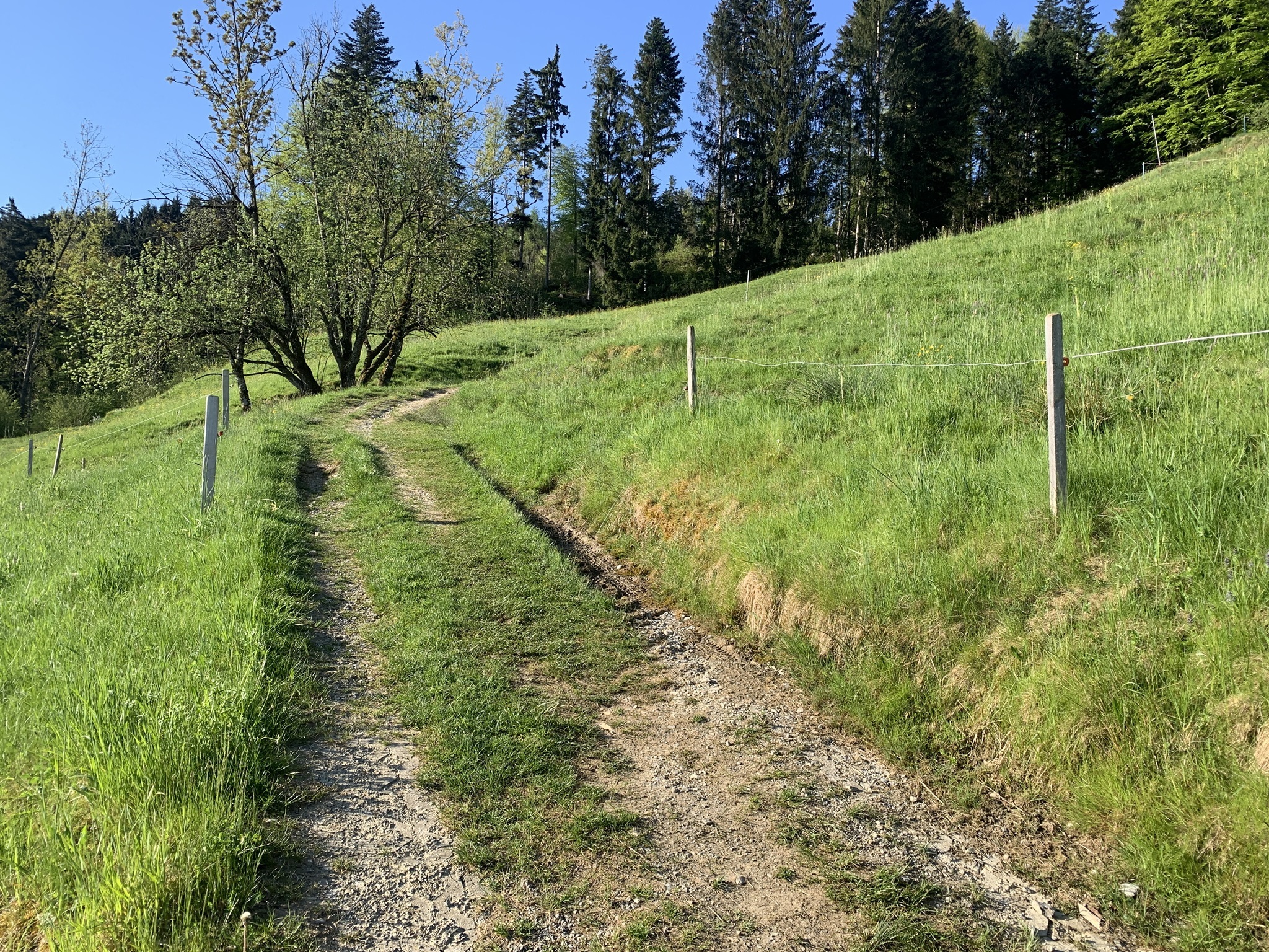 Zuerst geht es durch Appenzell, aber nach dem die Bahnlinie überquert ist geht steil durch einen Wald, danach über Wiesen zum sehr schön gelegenem Campingplatz Eischen. Schon hier sind die Weitblicke faszinierend!
