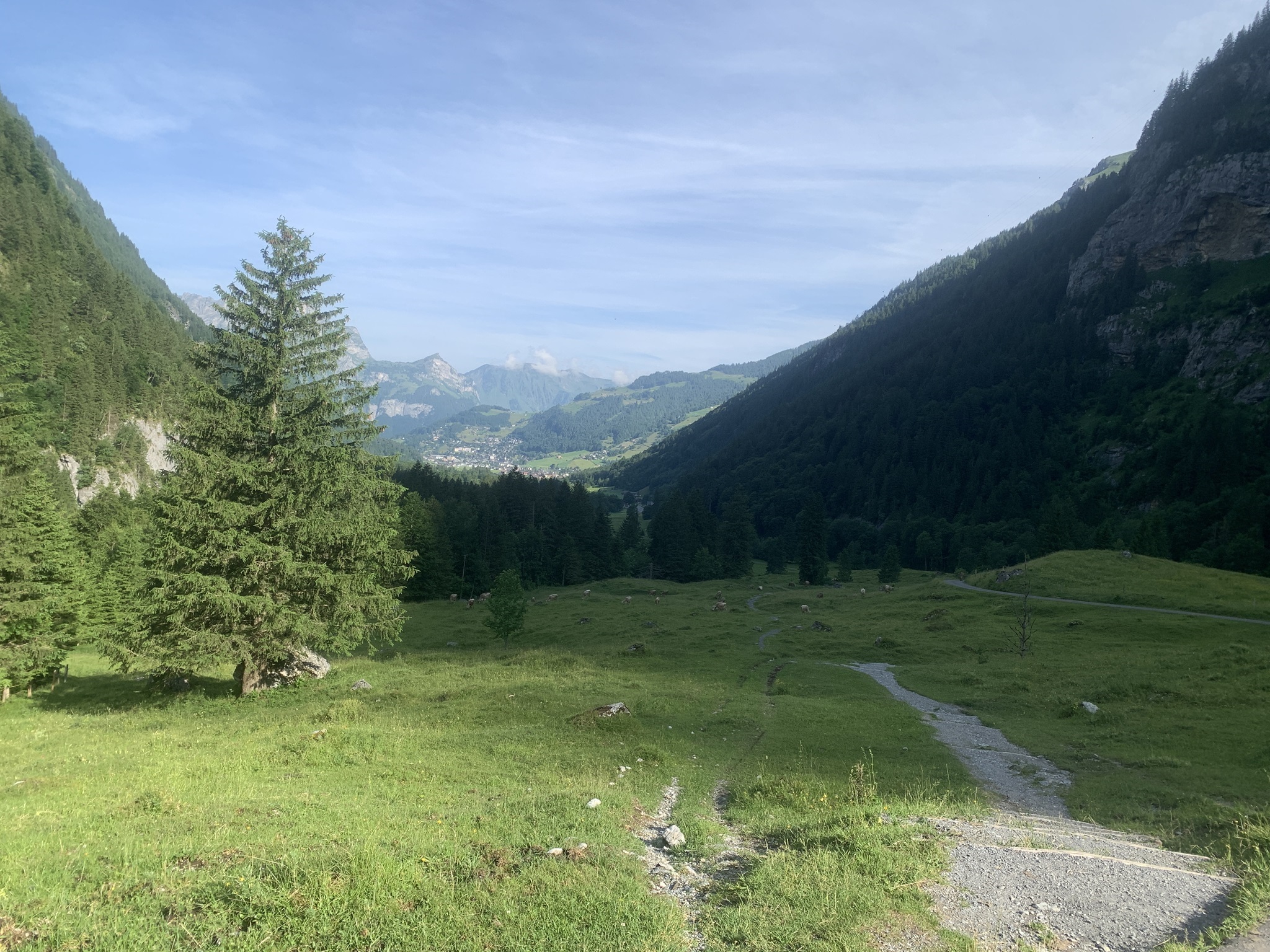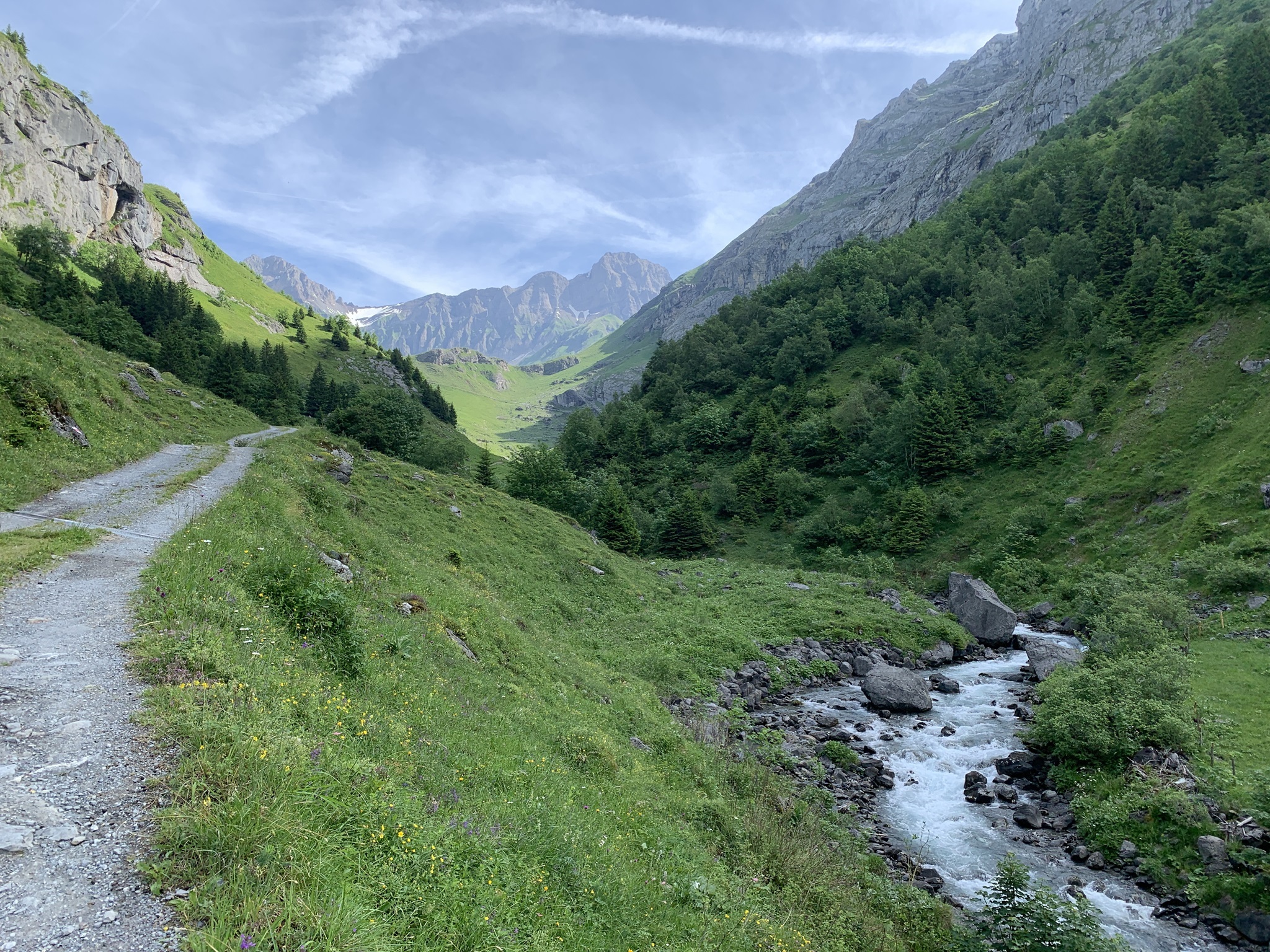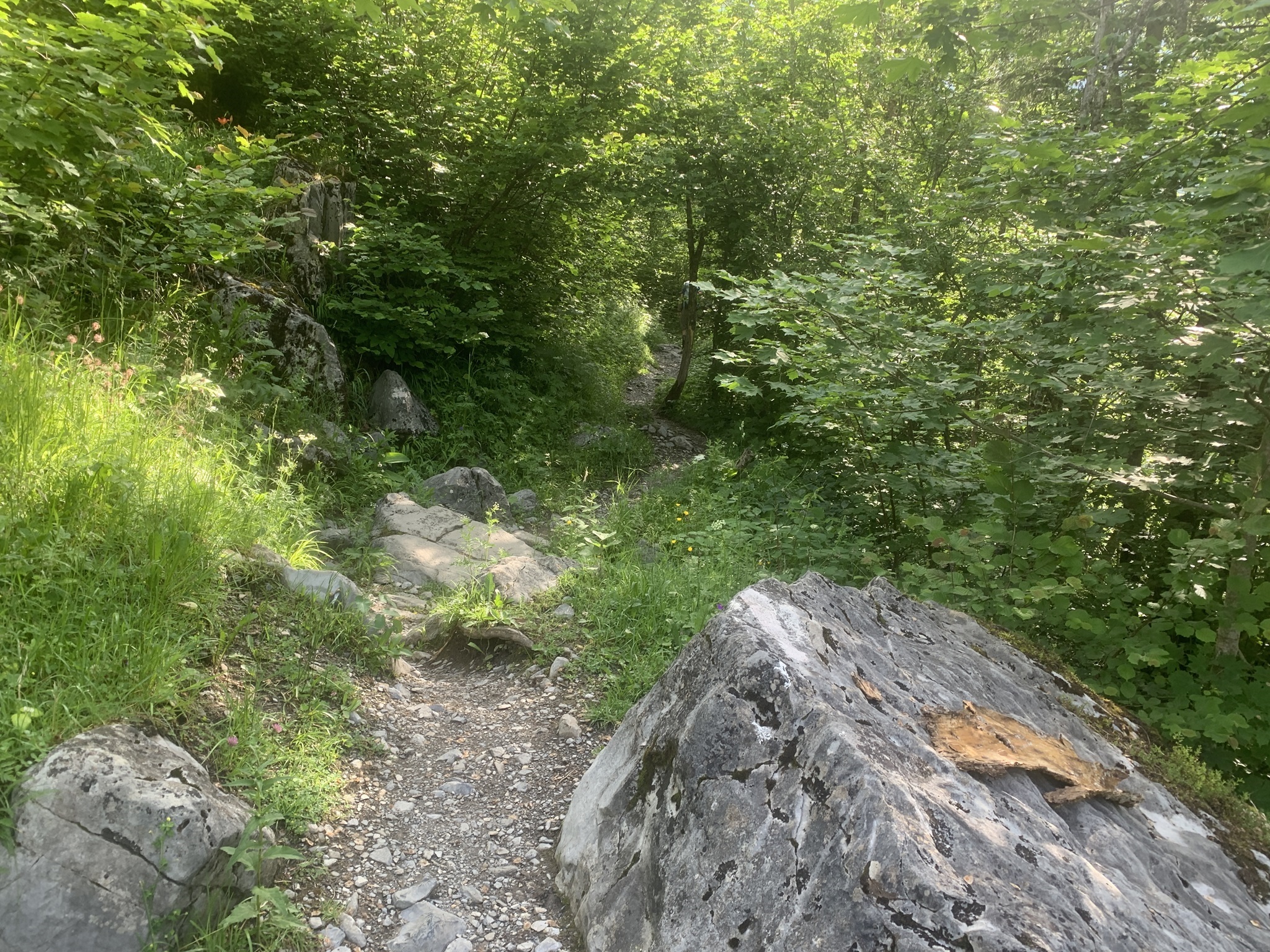 Zuerst geht es gemütlich Goldbodenalp. Vieles noch im Wald.