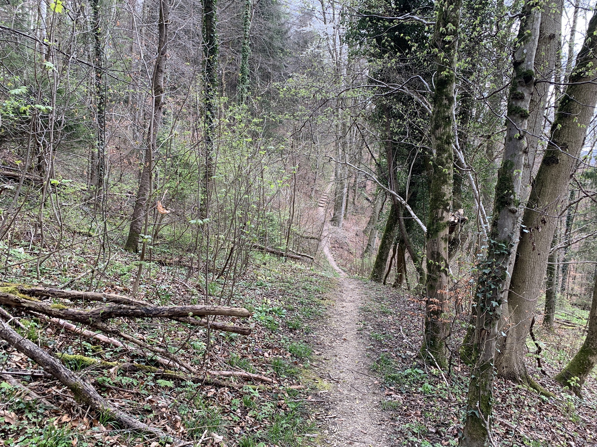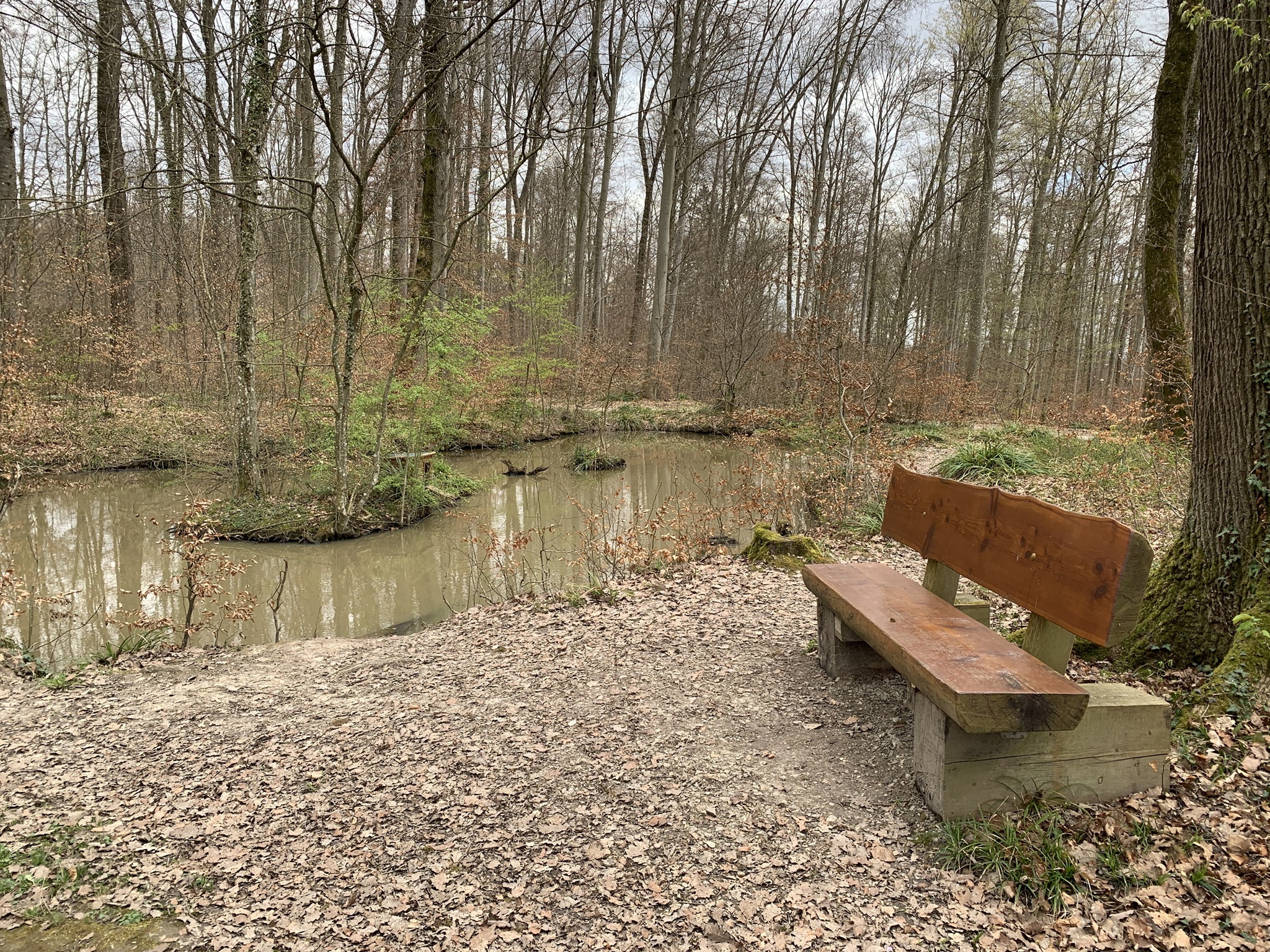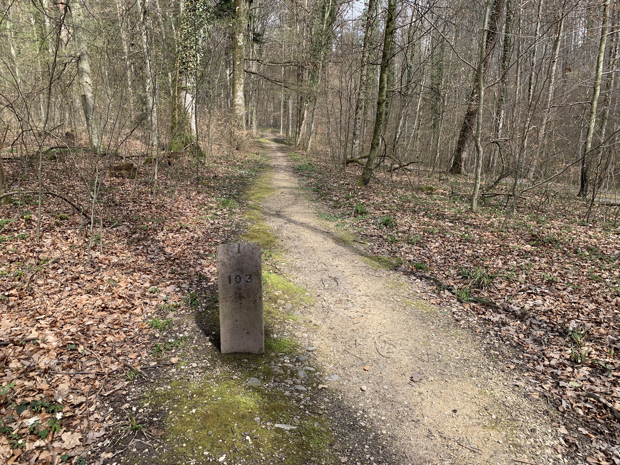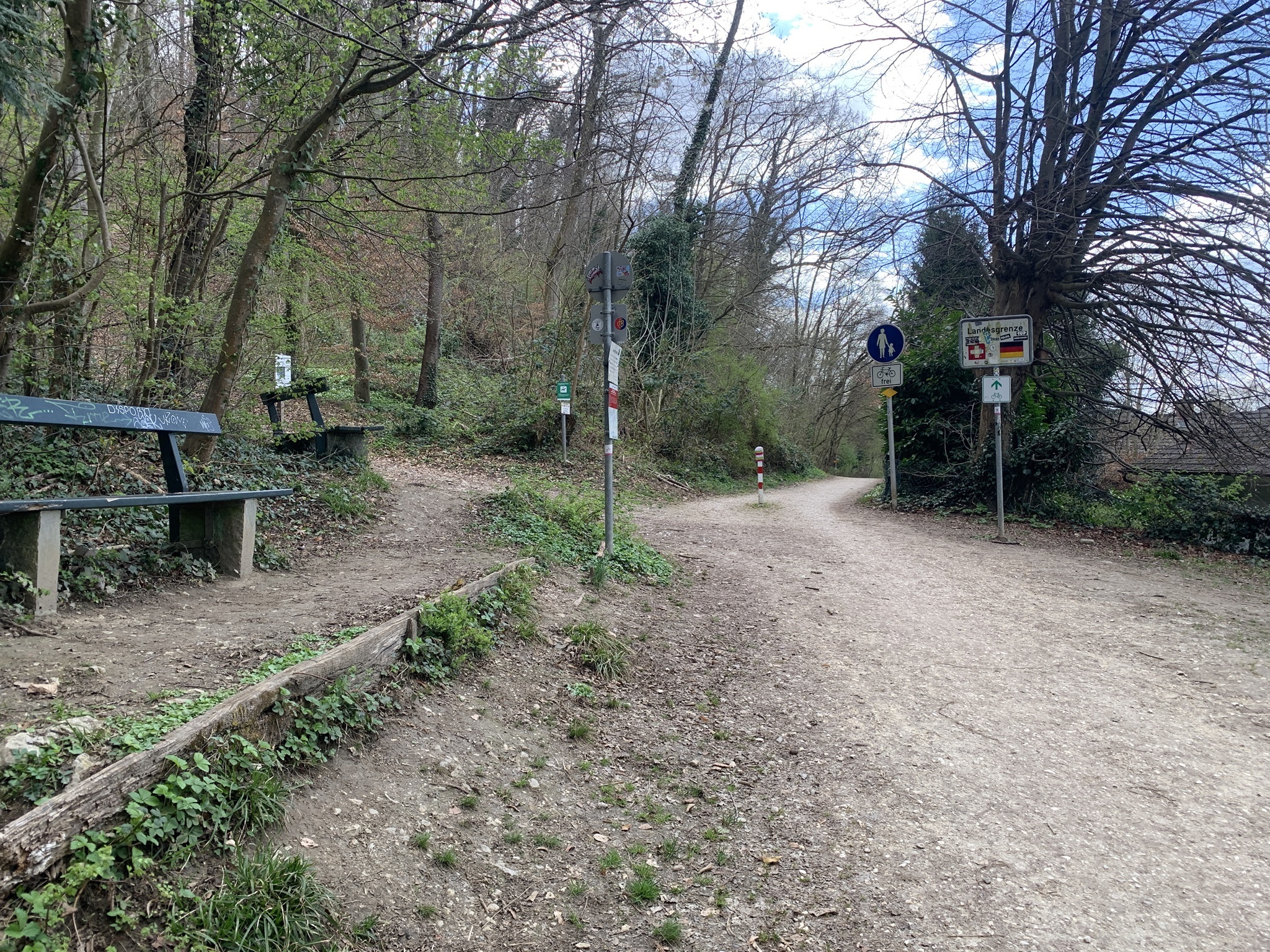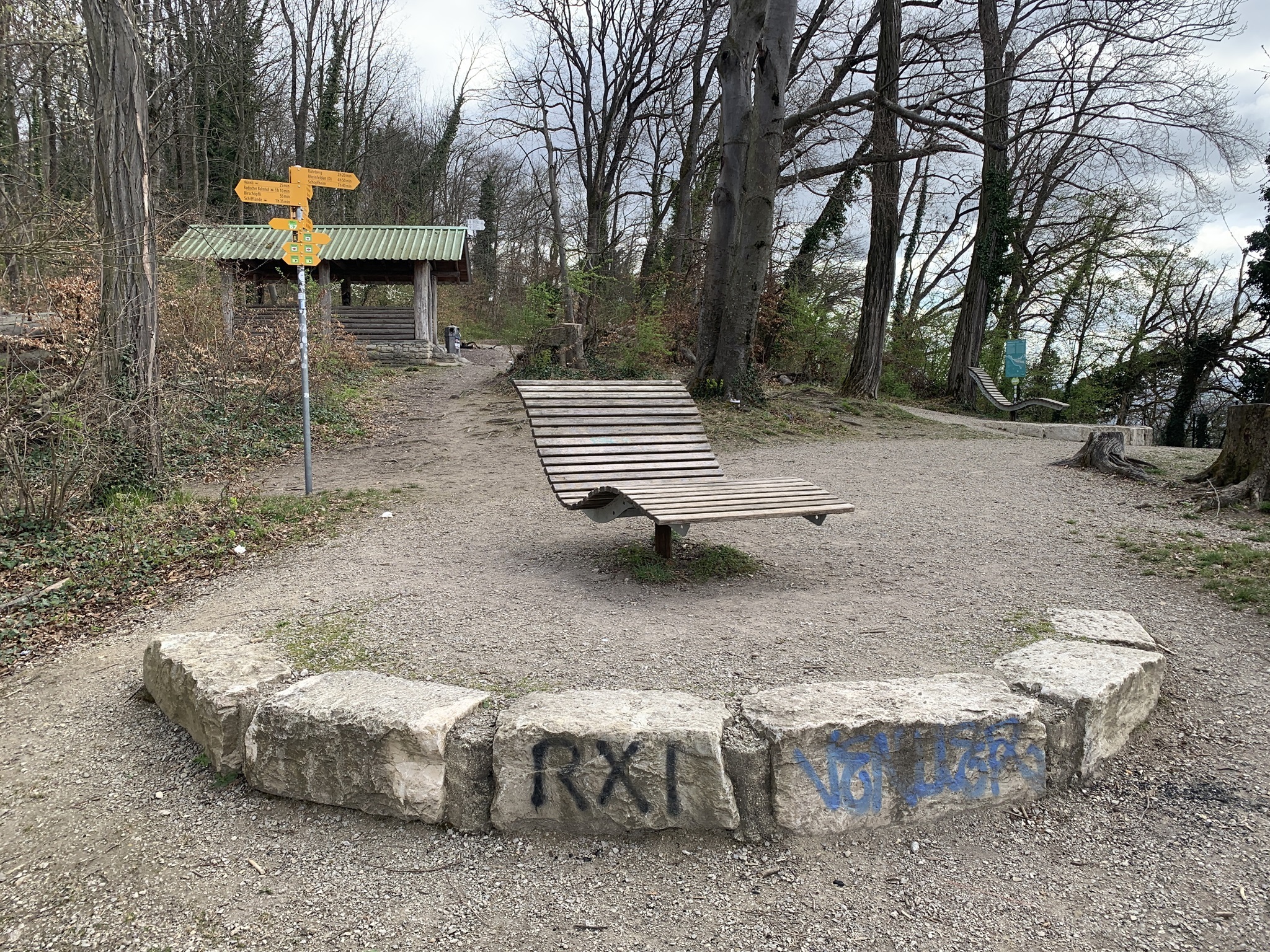 Beim Grenzstein 100 wanderte ich weiter Richtung Rührberg, aber kurz vor Ende des Waldes zweigte ich links am um via Nasser Grund zu meinem Lieblingsbänkli am Brizingerweg zu kommen. Zu meiner Überraschung war hier eine neue Bank! Danke liebe Gemeinde. Von hier ging es auf dem Grenzweg hinunter Richtung Riehen.