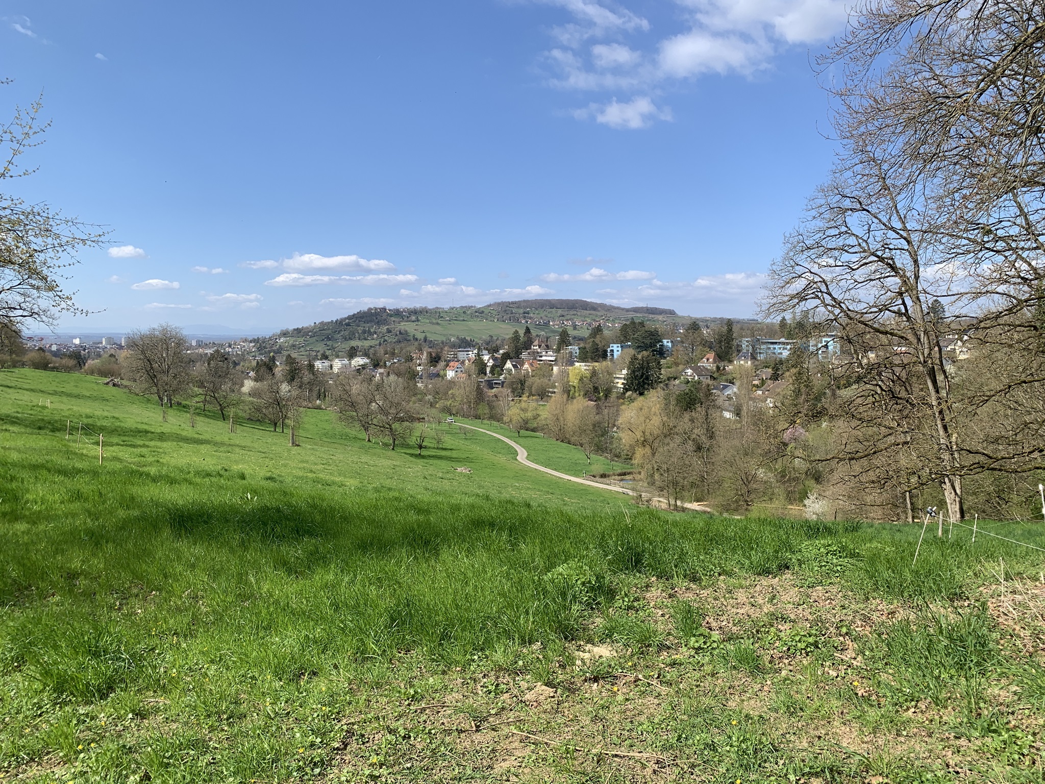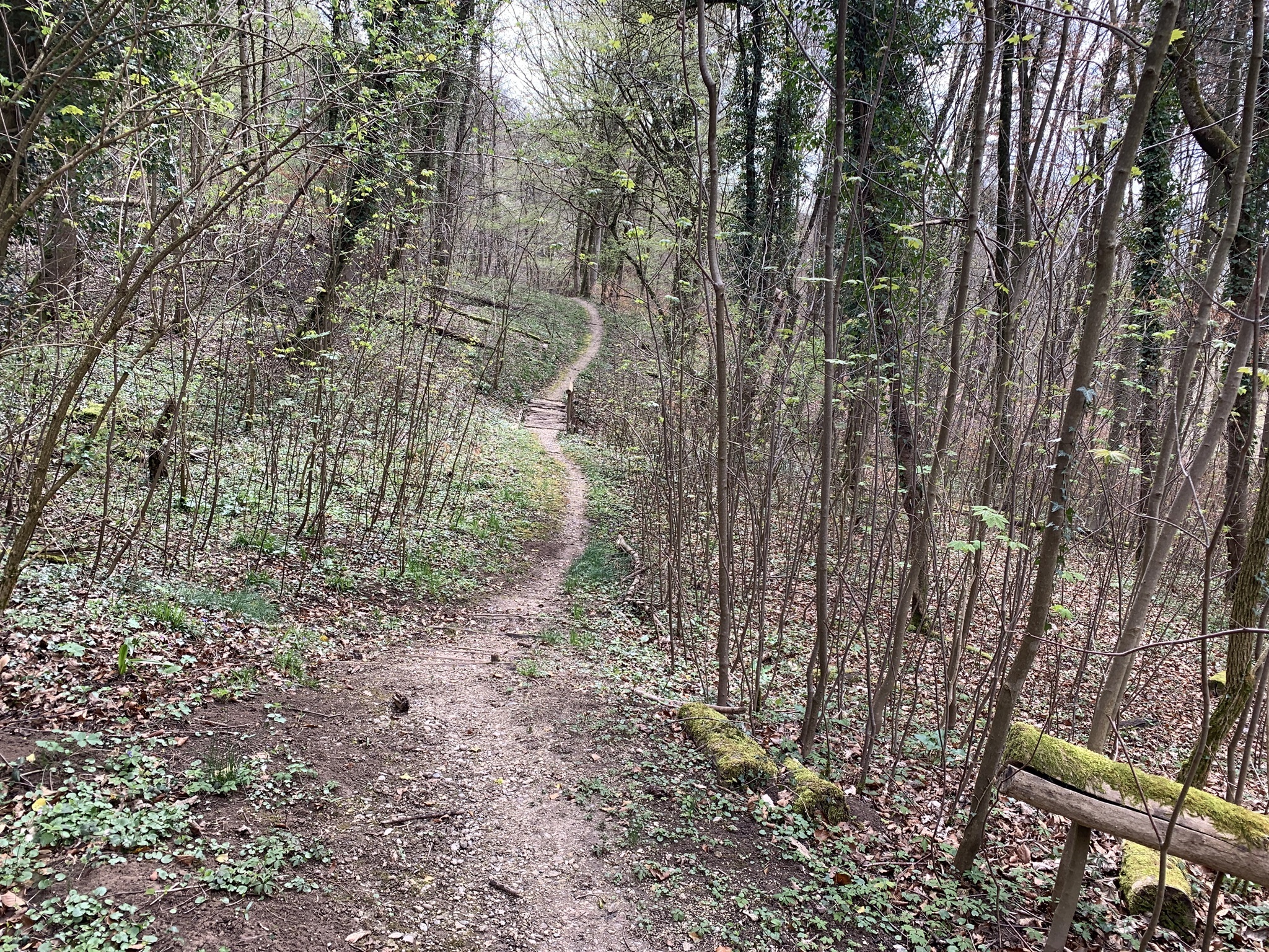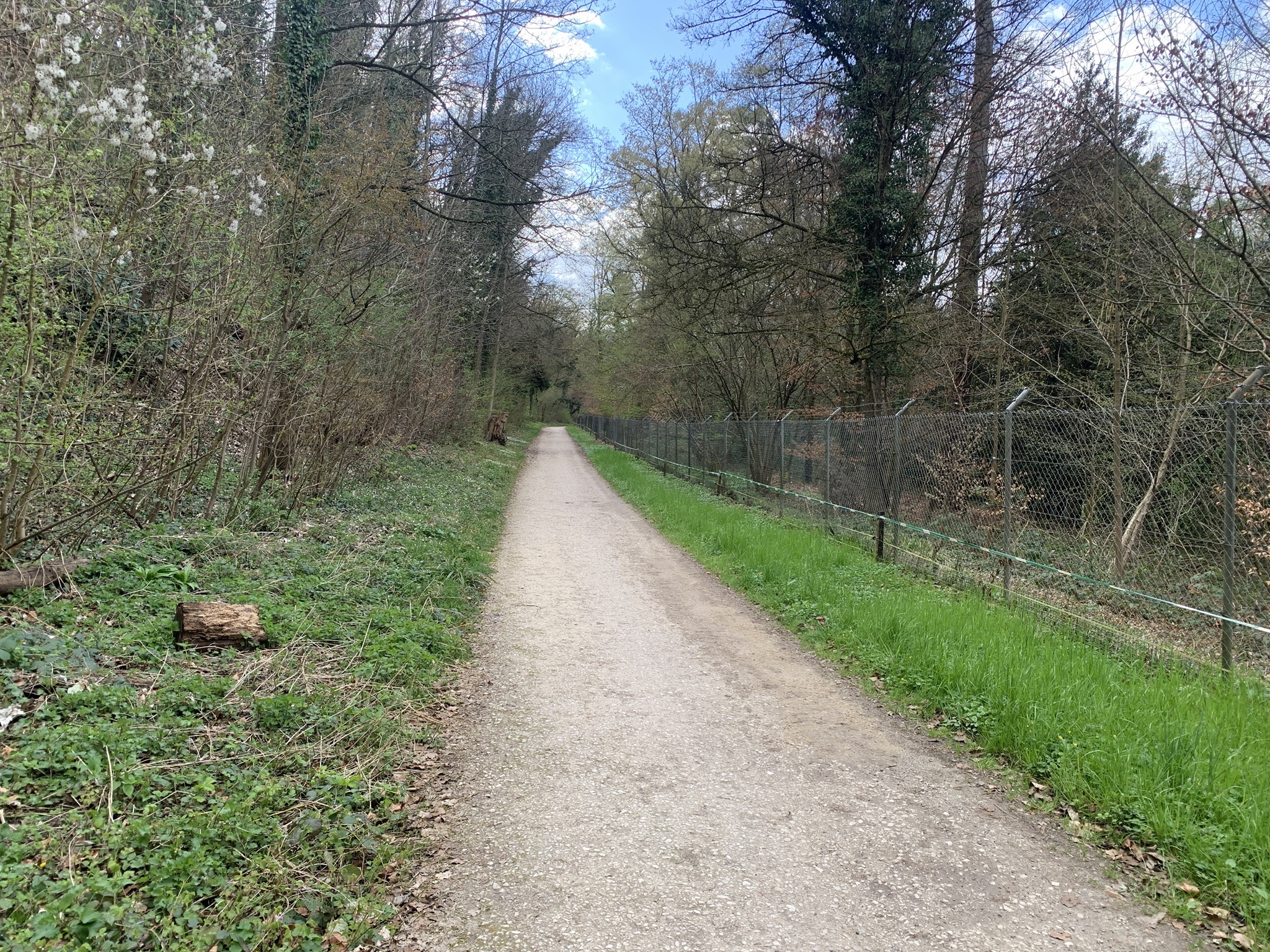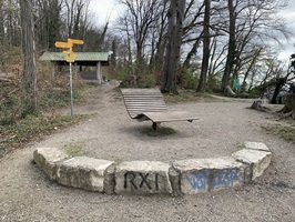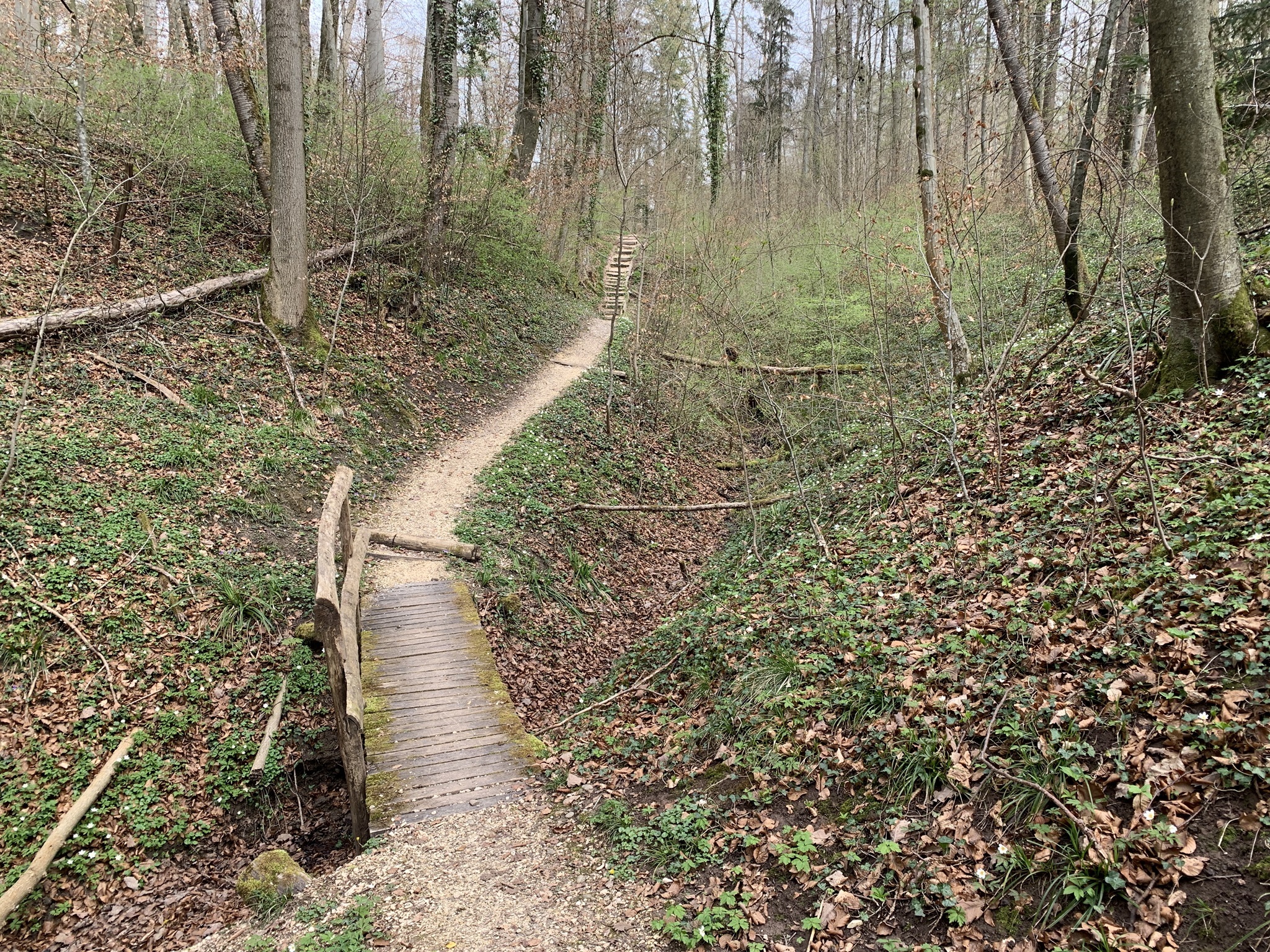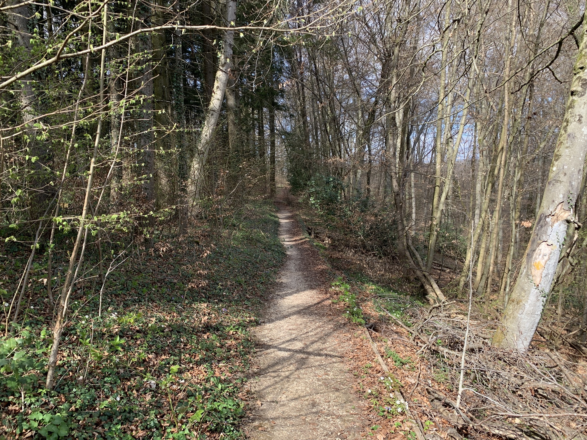 Beim Grenzstein 100 wanderte ich weiter Richtung Rührberg, aber kurz vor Ende des Waldes zweigte ich links am um via Nasser Grund zu meinem Lieblingsbänkli am Brizingerweg zu kommen. Zu meiner Überraschung war hier eine neue Bank! Danke liebe Gemeinde. Von hier ging es auf dem Grenzweg hinunter Richtung Riehen.