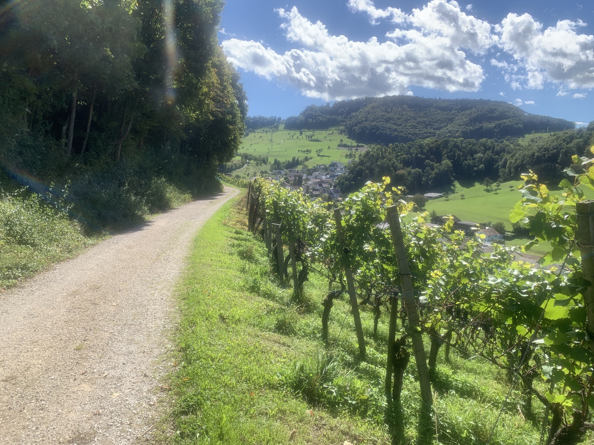 Oben angekommen geht es auf Mergelstrassen hinunter nach Zeinigen. Am Schluss geht es durch die Rebberge.
