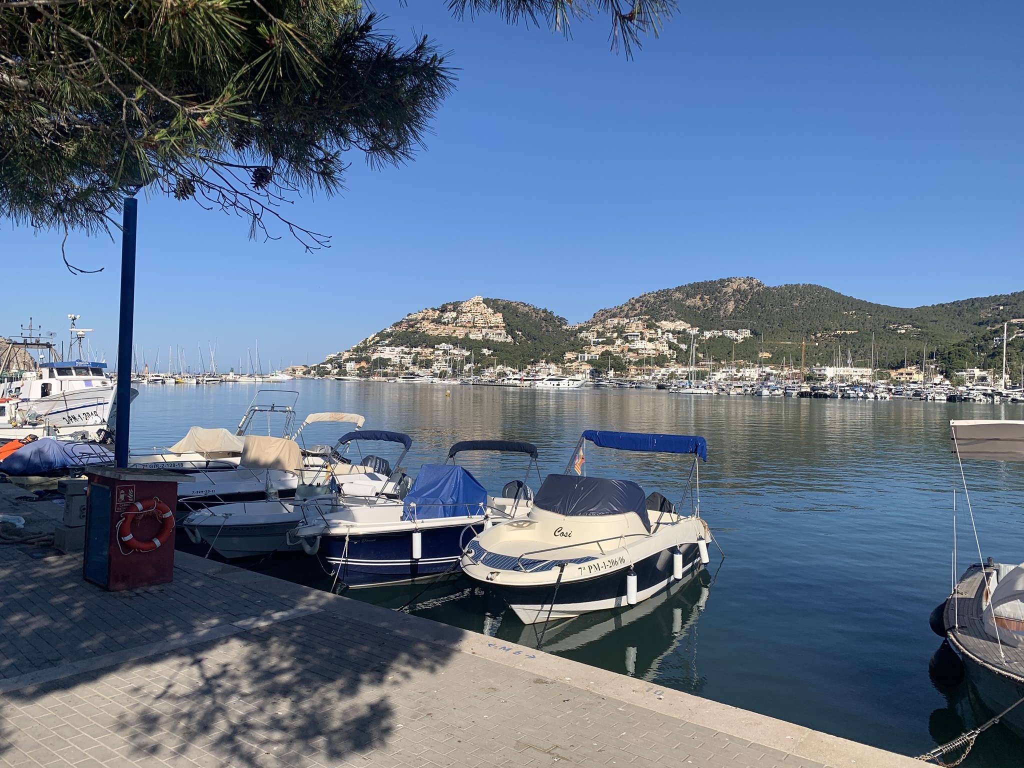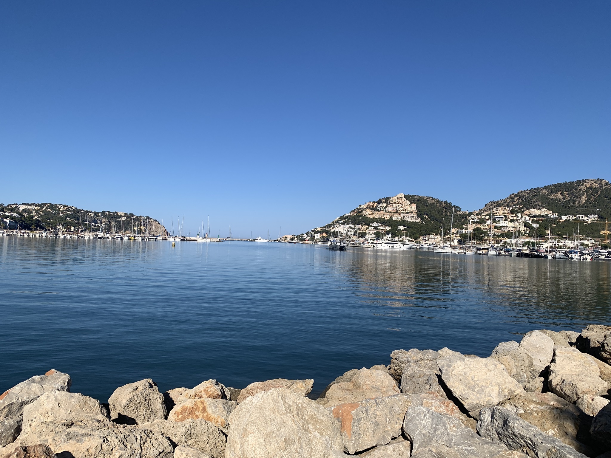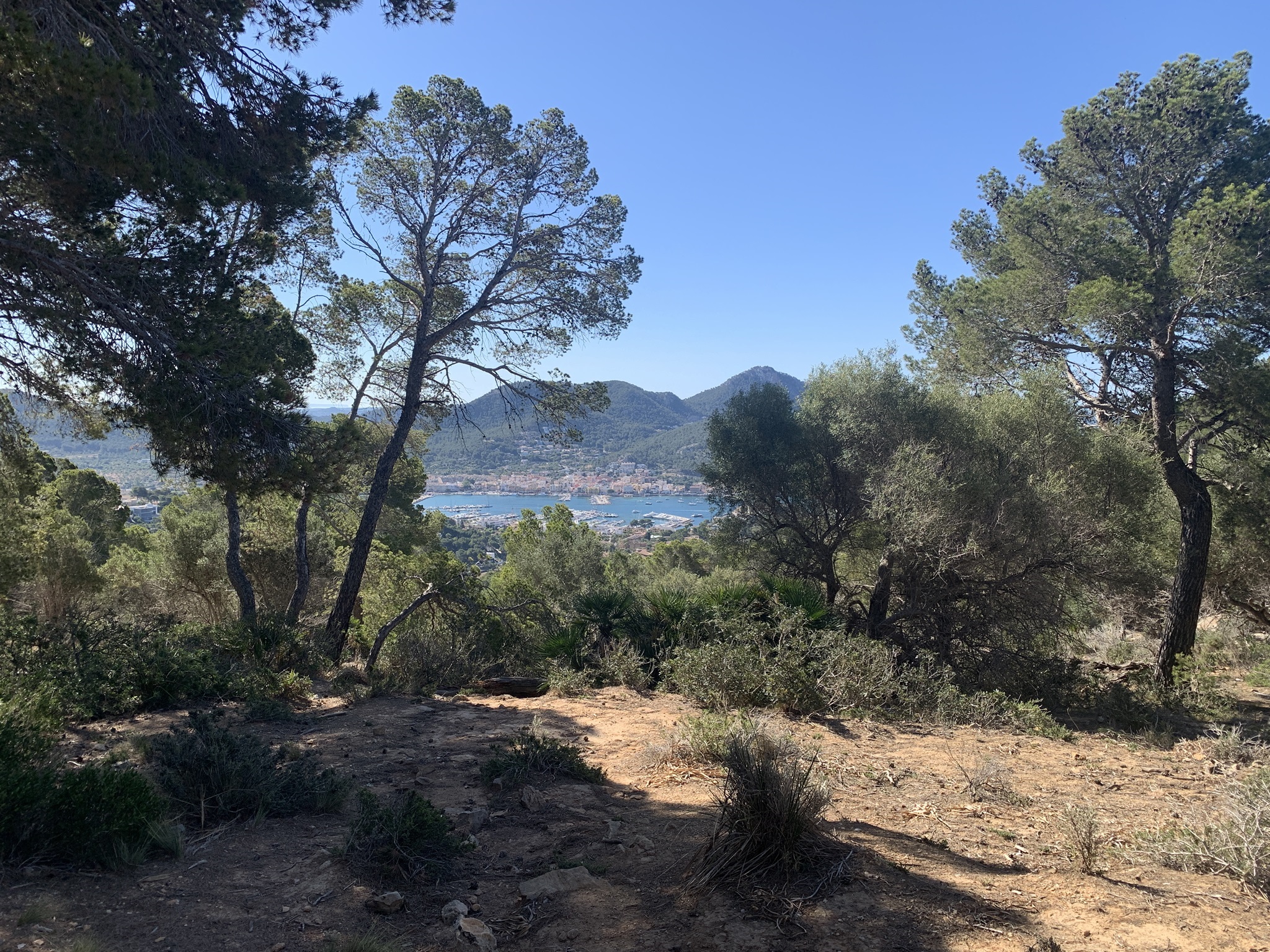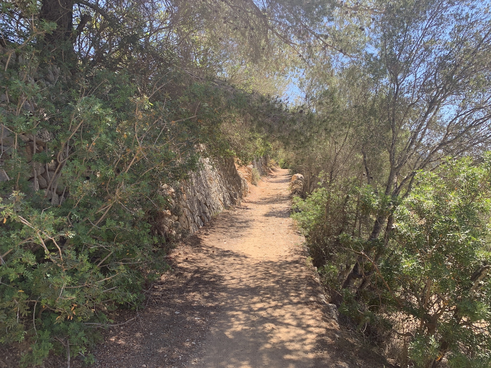 Hier geht es zuerst am Hafen mit unzähligen Booten entlang. Danach geht es kurz durch die Strassen von Port Andrax. Weiter oben geht es dann über Wanderwege weiter hinauf. Oben angelangt geht es flacher weiter bis zu dem Aussichtspunkt den ich bereits kenne. Auch der Weg danach durch den Felsenweg ist dieses Jahr bereits erwandert worden. Aber danach zweige ich rechts ab und es geht auf Schotter- und Teerstrassen hinunter.
