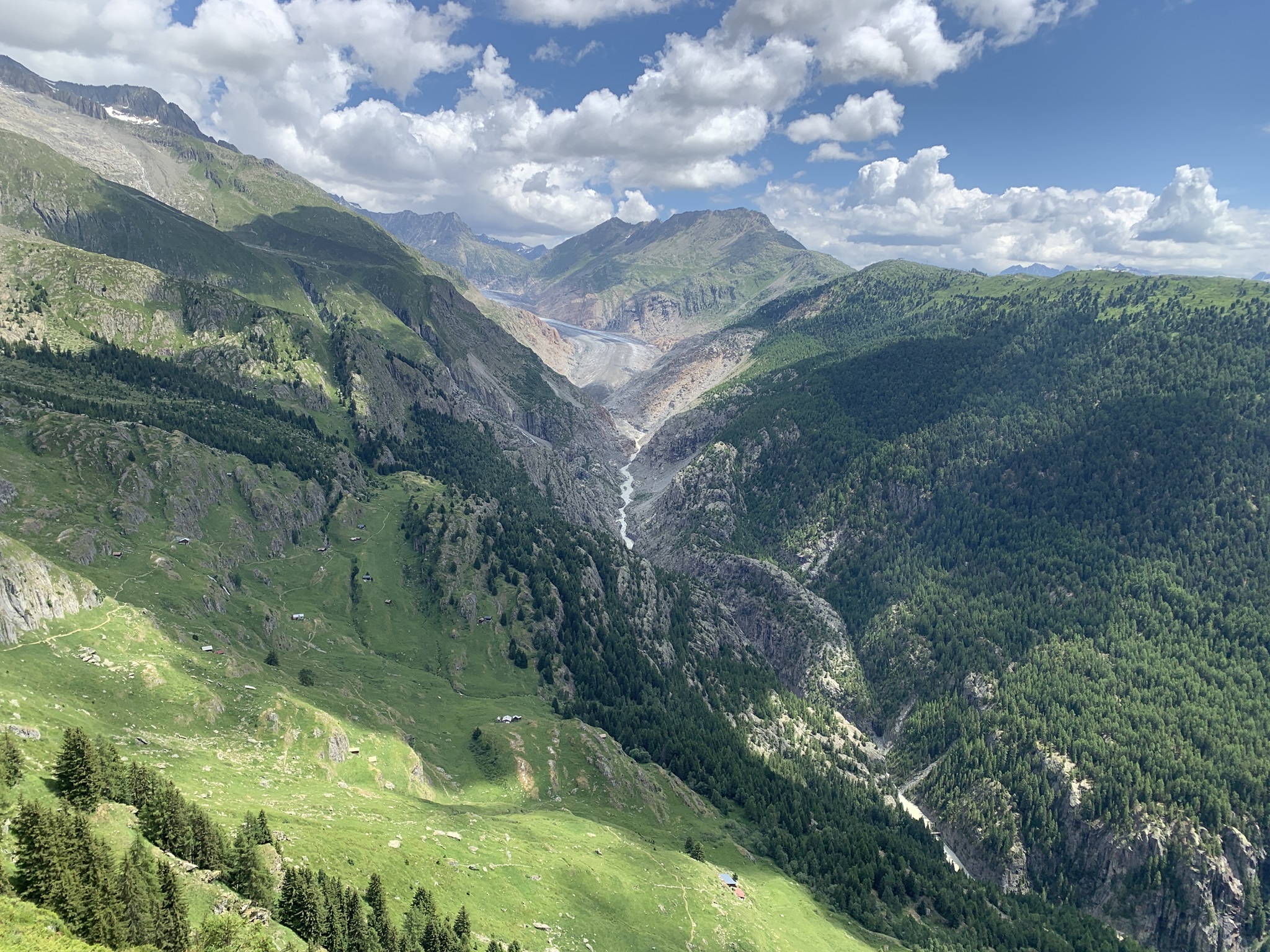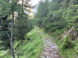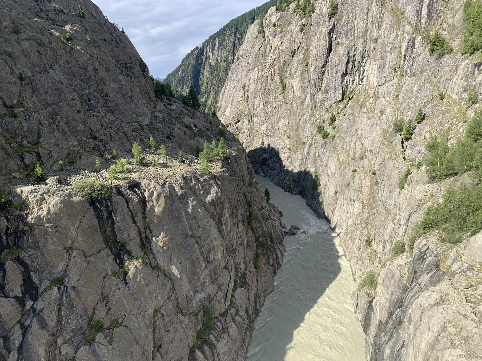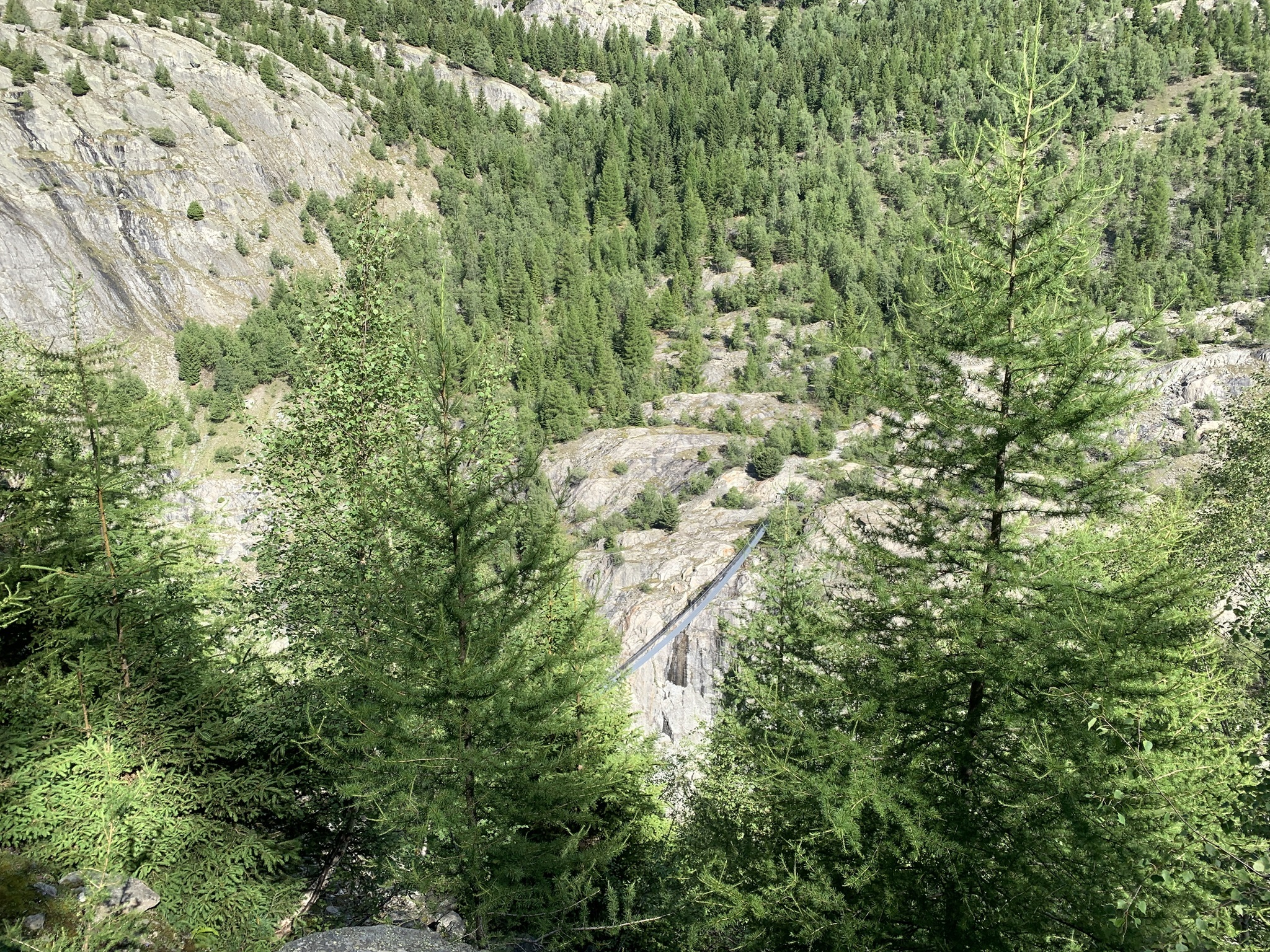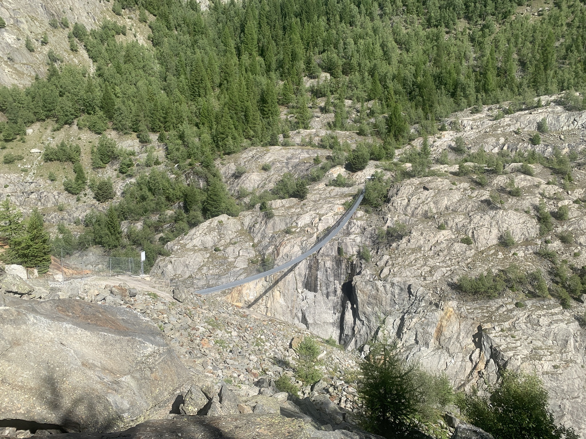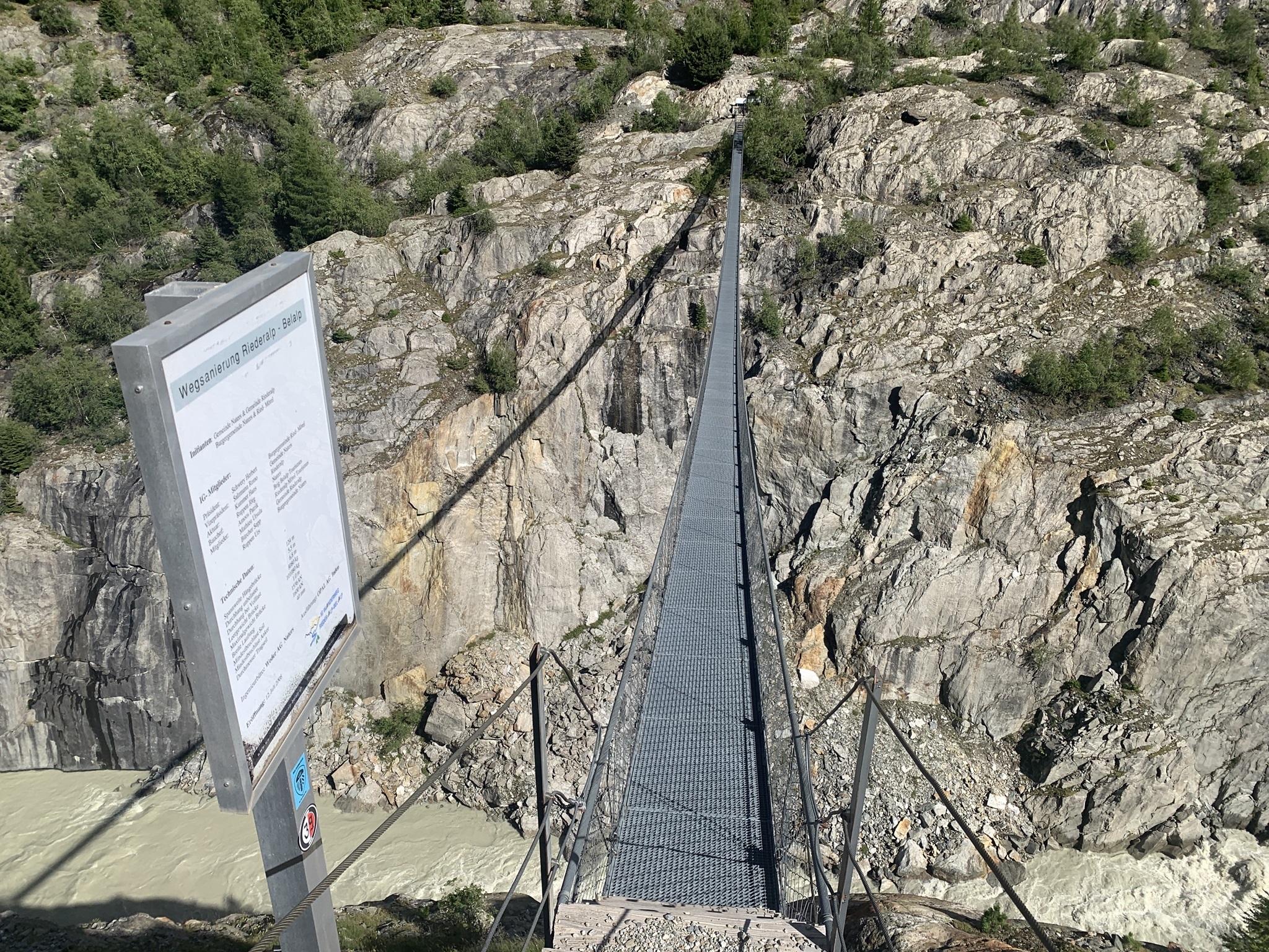 Auch heute ging es zuerst auf die Riederfurka. Aber von hier ging es danach zum Teil sehr steil auf sehr glitschigen Wegen hinunter zu der Hängebrücke. Es hat am Abend davor sehr stark geregnet, daher wirklich sehr rutschig.