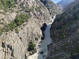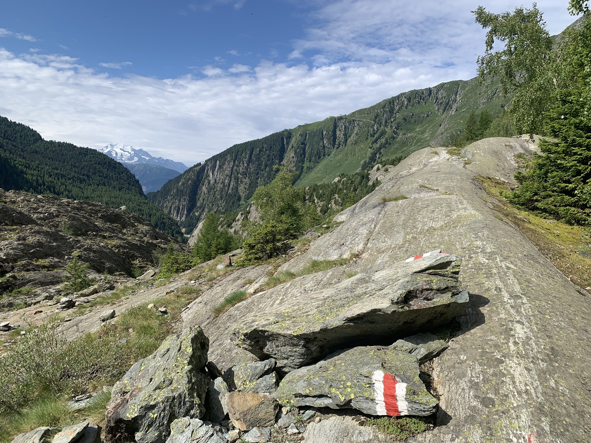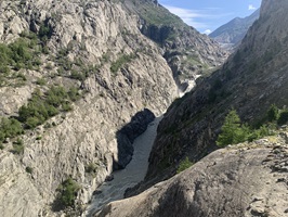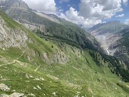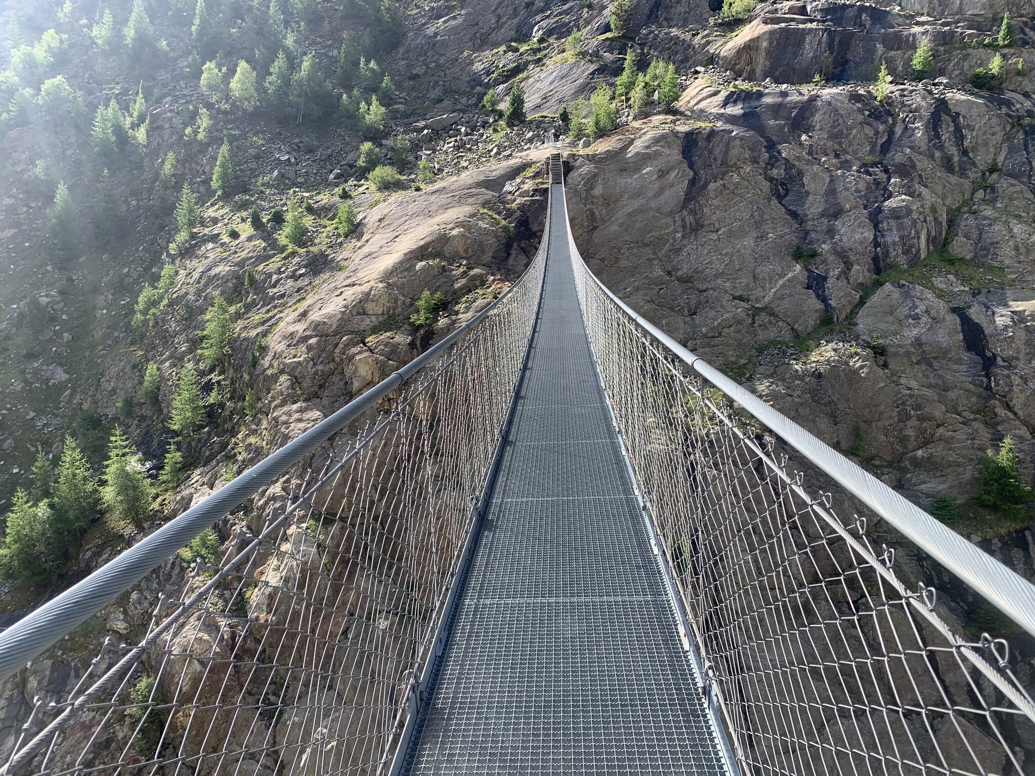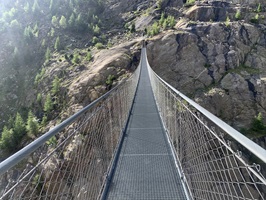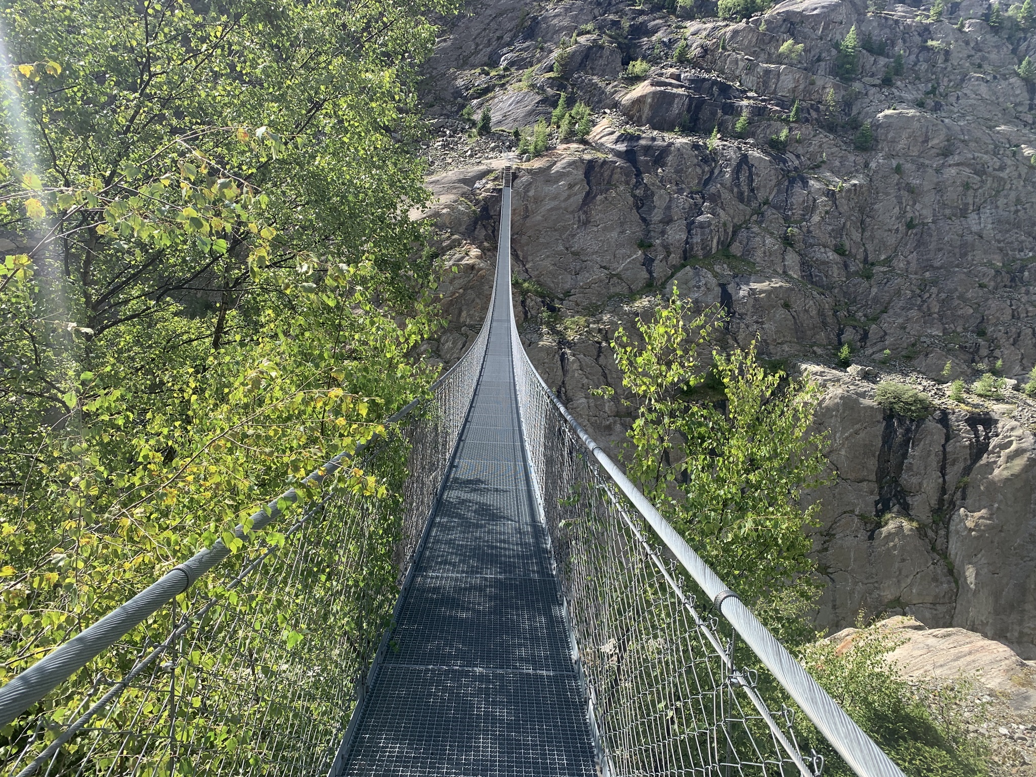 Die Überquerung der Massa auf der Hängebrücke war für mich kein Problem. Danach geht es über Gletschermuränen wieder hoch. Danach folgen Wege durch Wälder und dann über Bergwanderwege. Fast zu oberst geht es noch einmal sehr steil auf einem Zik-Zak-Weg nach oben. Aber die Aussicht ist immer traumhaft!!