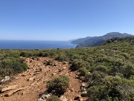 Von hier geht der Weg um einen Berg herum mit Sicht auf die steile Küste. Jetzt folgt ein kleiner Abstieg um danach wieder ein kleines Stück hinauf.