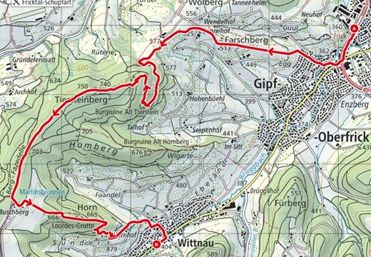 - Route: Frick - Sunnehof - Burgruine Alt-Tierstein - Tiersteinberg - Buschberg - Lourdes Grotte - Wittnau